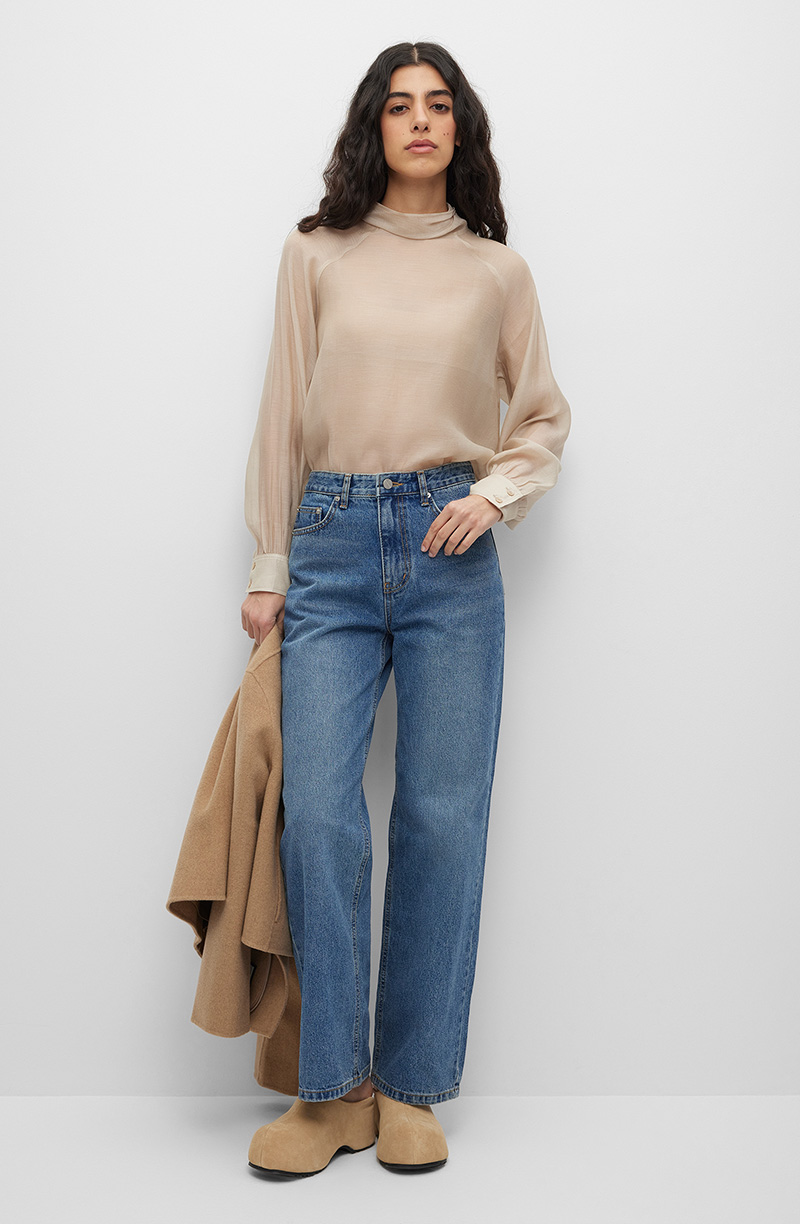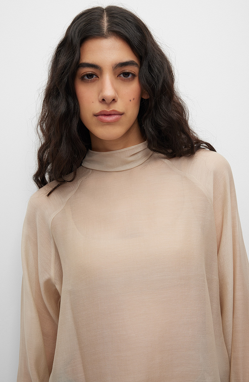 Блуза свободного кроя из струящейся ткани. Модель со слегка спущенной линией плеча и присборенной проймой создает мягкий объемный силуэт. Высокий воротник-шлейф мягко облегает шею, завязывается сзади на узел или бант. Длинные рукава заужены к низу и дополнены широкими манжетами со складками. Прямой ровный низ завершает лаконичный крой. Ткань легкой фактуры обладает гладкой поверхностью, приятна к телу и хорошо пропускает воздух. Блузу можно комбинировать с классическими брюками, юбками-карандаш или джинсами. Модель подходит для создания образов в деловом стиле, для встречи с друзьями или прогулок. Легкая фактура тенселя позволяет сочетать блузу с жакетами прямого кроя или кардиганами.