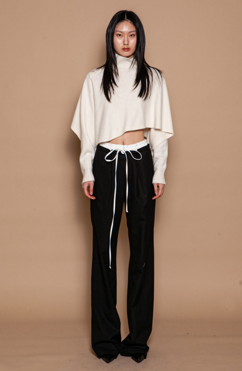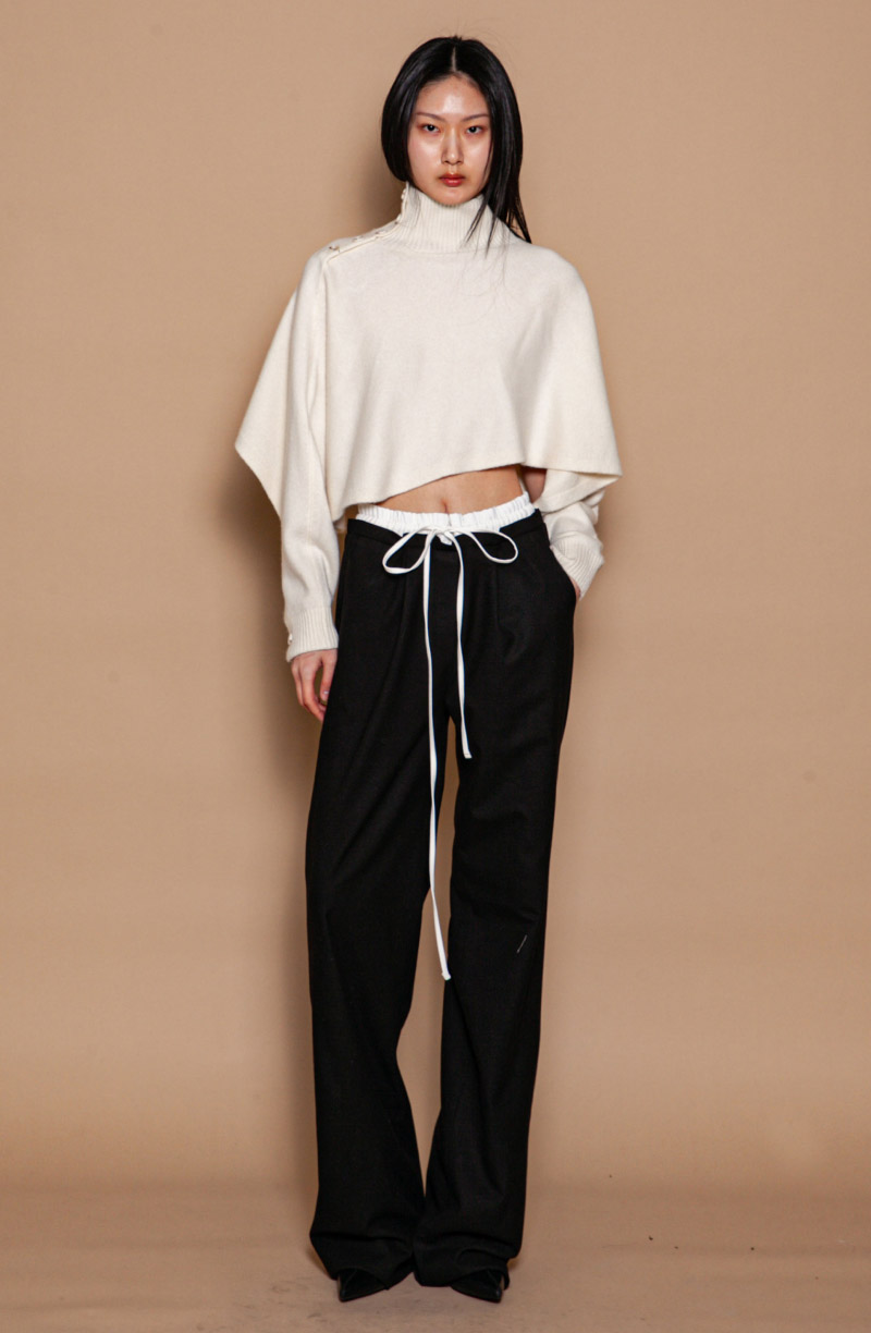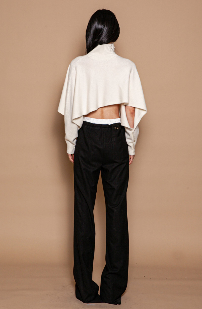 Укороченный свитер с высоким воротом и пуговицами на плечах привлекает внимание мягкой линией и современным кроем. Цельнокроеные рукава застёгиваются на манжетах и открывают локти, создавая изящный акцент. Свободная посадка и длина до линии талии придают образу лёгкость и непринуждённость. Трикотаж из шерсти с добавлением кашемира отличается особой мягкостью и шелковистостью. Материал приятно согревает, дышит и комфортно ощущается на коже. Эластичная вязка манжет и воротника сохраняет форму и делает силуэт аккуратным. Такой свитер легко сочетается с юбками и брюками на высокой талии, подчеркивая пропорции фигуры. Он гармонично смотрится поверх платьев и рубашек, добавляя многослойности и выразительности как в повседневных, так и в деловых образах.