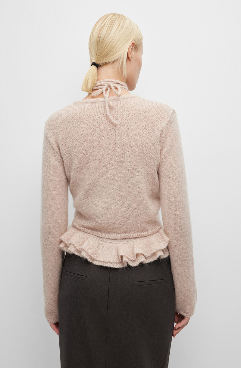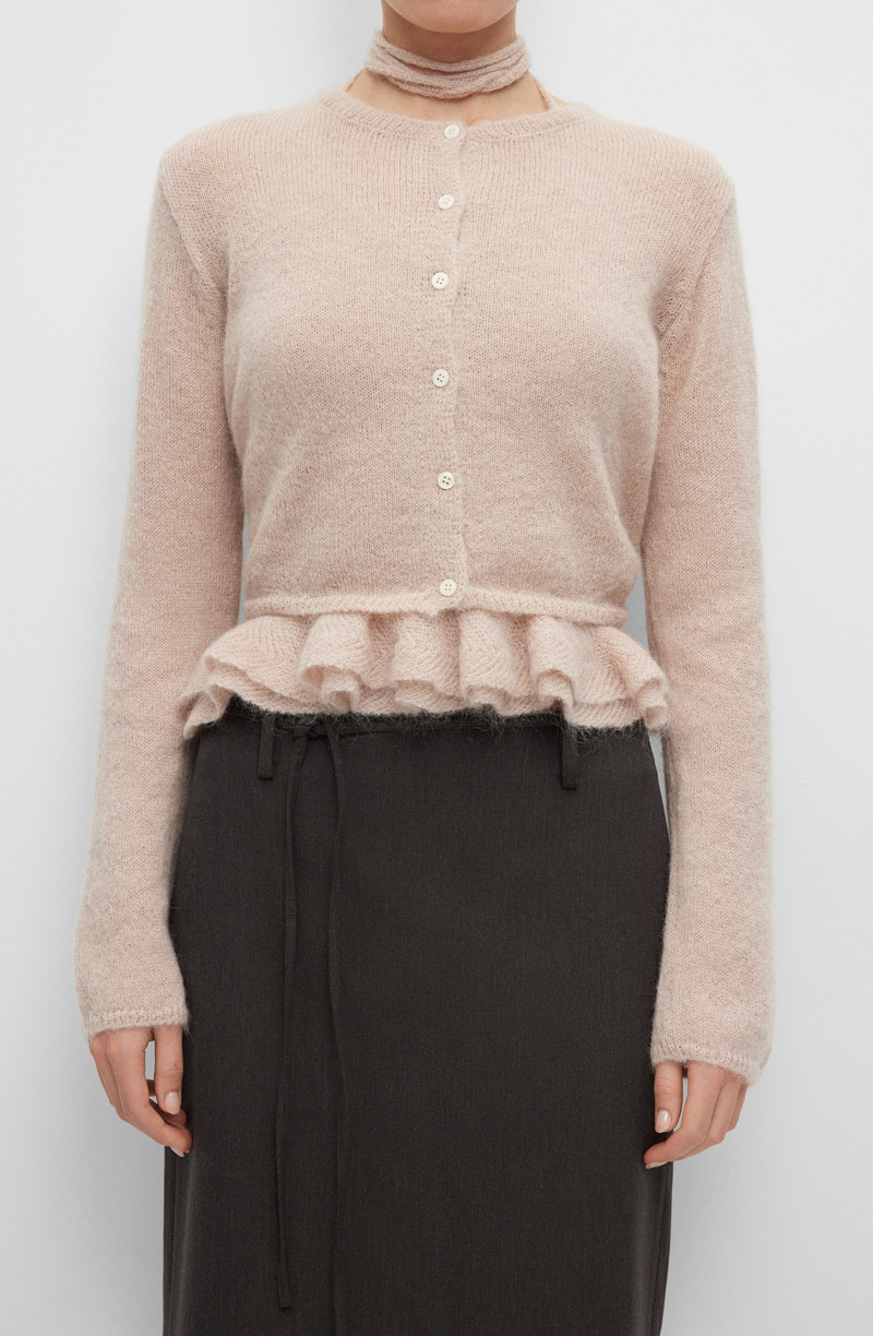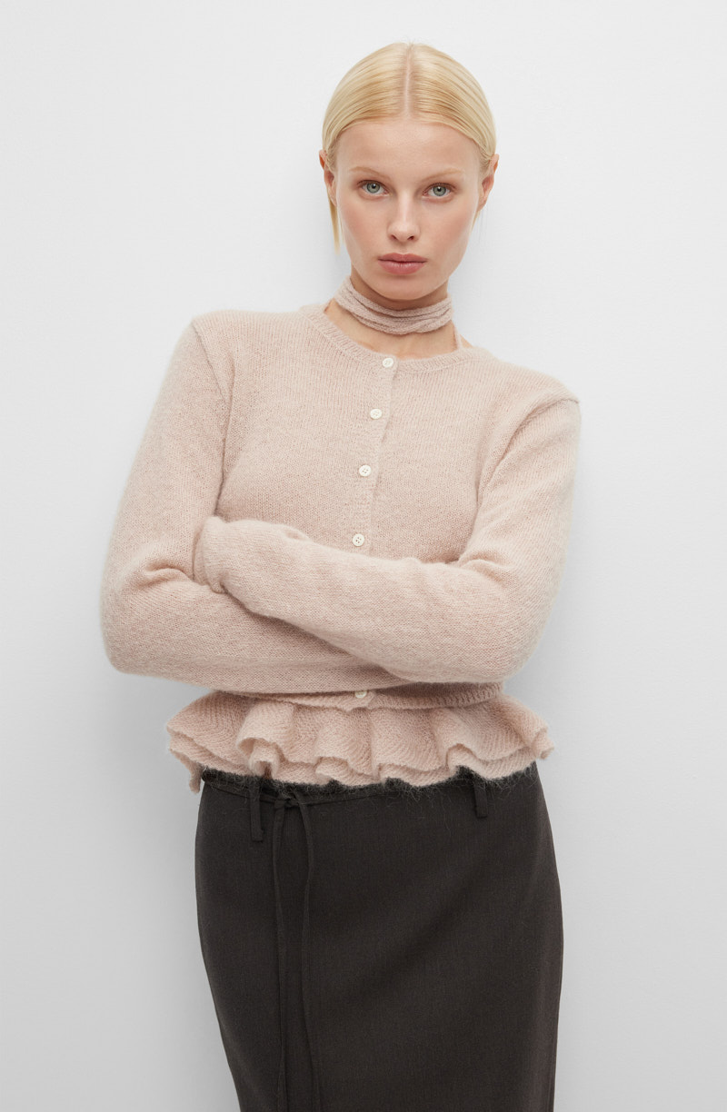 Кардиган приталенного кроя с фигурной линией горловины и длинными рукавами. Филигранная баска по низу создает выразительный силуэт с мягким расширением. Застежка на скрытых пуговицах подчеркивает лаконичность дизайна. Атласная подкладка в нижней части обеспечивает плавность драпировки. Комбинированная пряжа с мохером и шерстью обладает объемной текстурой и повышенной теплоизоляцией. Материал сохраняет легкость, создавая эффект воздушности. Кардиган сочетается с платьями-футлярами и брюками-клеш, шелковыми блузами и жемчужными аксессуарами. Модель можно носить с обувью на изящном каблуке и клатчами, создавая вечерние образы.
