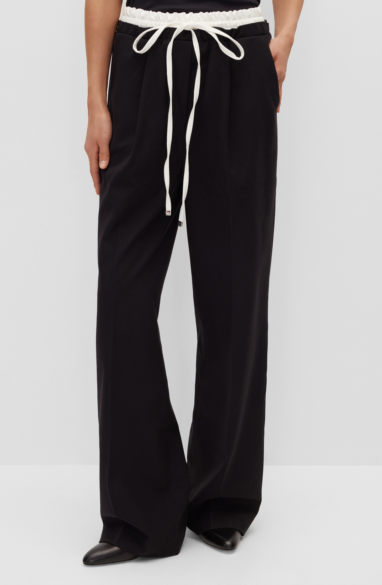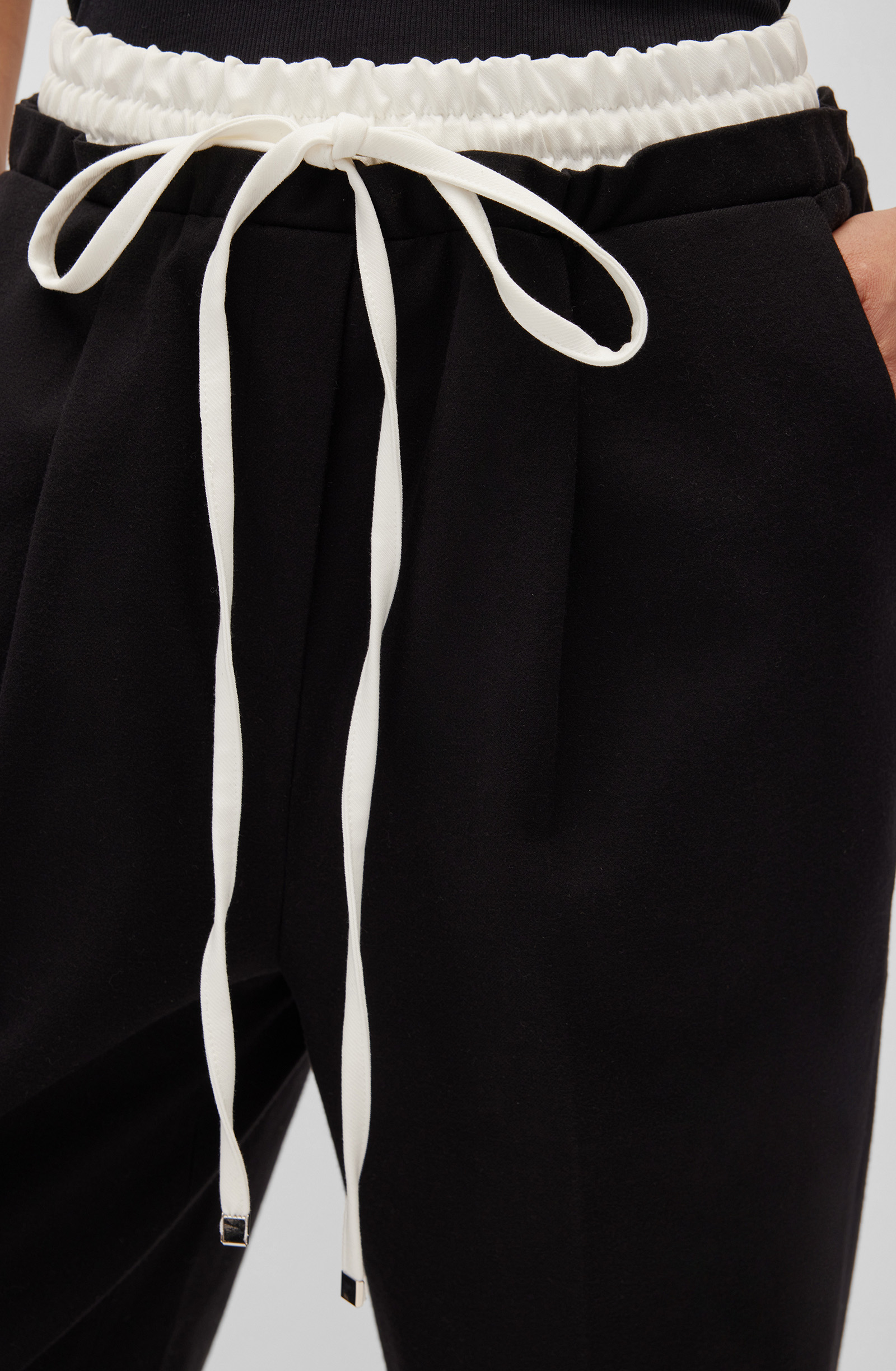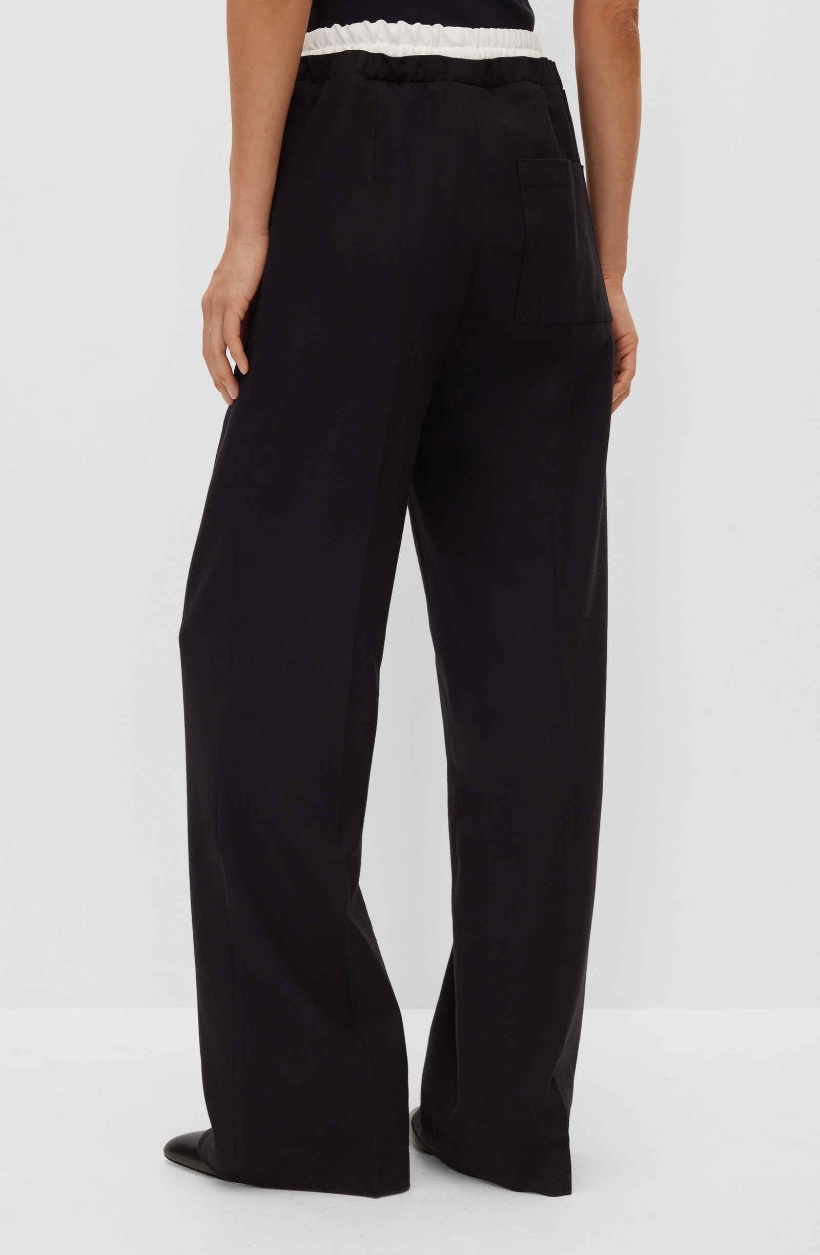 Прямые брюки длиной в пол со слегка расклёшенным книзу силуэтом создают вытянутую вертикаль и формируют элегантный образ с акцентом на линию ног. В боковых швах расположены удобные карманы, сохраняющие чистоту силуэта и придающие модели функциональность. Широкий пояс с кулиской позволяет регулировать посадку и адаптировать брюки под индивидуальные предпочтения. Ткань мягкая, пластичная и приятная к телу, драпируется плавными складками и держит форму в течение дня. Благодаря сбалансированной плотности материал не утяжеляет силуэт и сохраняет ощущение лёгкости при носке. Брюки подойдут для повседневных и дорожных образов: они легко сочетаются с укороченными куртками, жилетами, тонкими водолазками, мягкими джемперами или футболками. С вязаным топом модель приобретает более расслабленный характер, а в комбинации с лёгким свитером смотрится кэжуально.