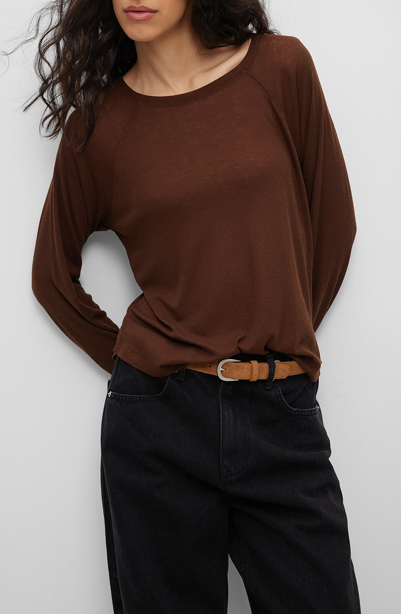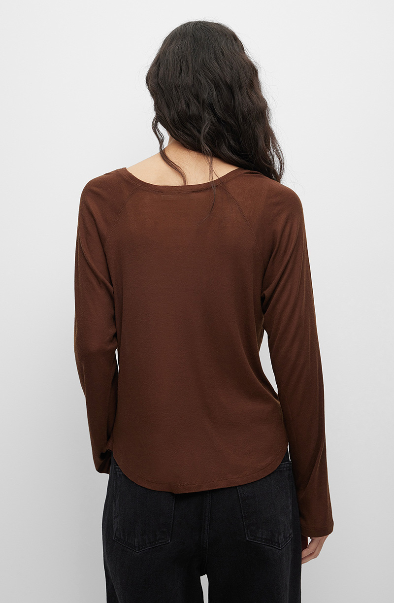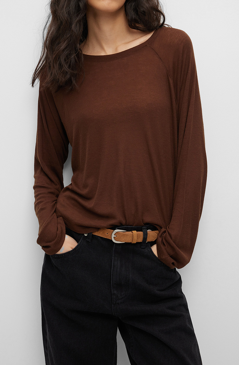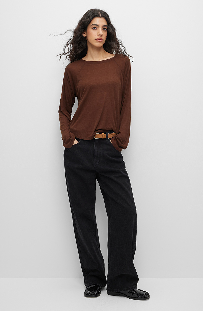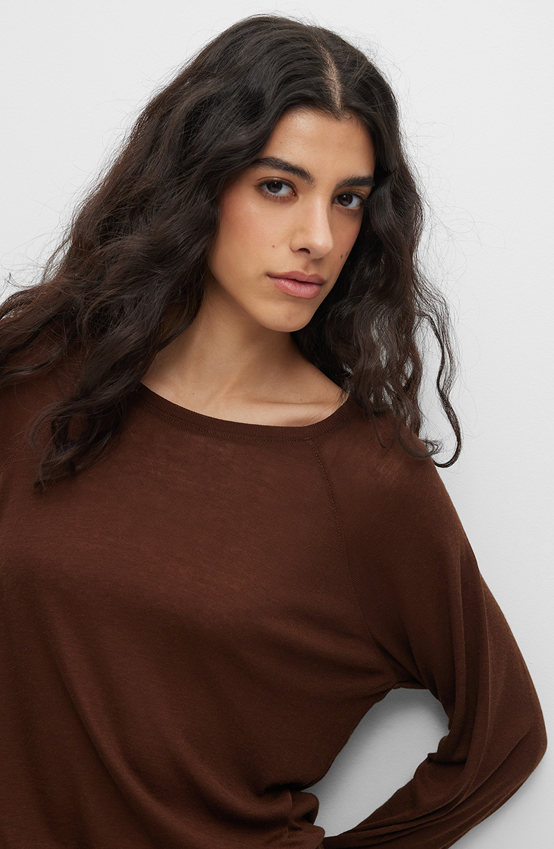 Лонгслив свободного силуэта. Модель с рукавами-реглан обеспечивает свободу движений. Прямой крой создает непринужденную объемную форму, мягко ниспадающую к фигурному низу. Ткань на основе тенселя с добавлением шерсти обладает струящейся текстурой и повышенной воздухопроницаемостью. Материал отличается тактильной мягкостью, сохраняет тепло и обеспечивает комфортный микроклимат в любую погоду. Лонгслив комбинируется с брюками-клеш и юбками-макси, плотными джоггерами и вельветовыми жилетами. Хорошо смотрится под массивные ботинки и объемные аксессуары. Насыщенный коричневый цвет делают лонгслив универсальным элементом для осенне-весеннего сезона.