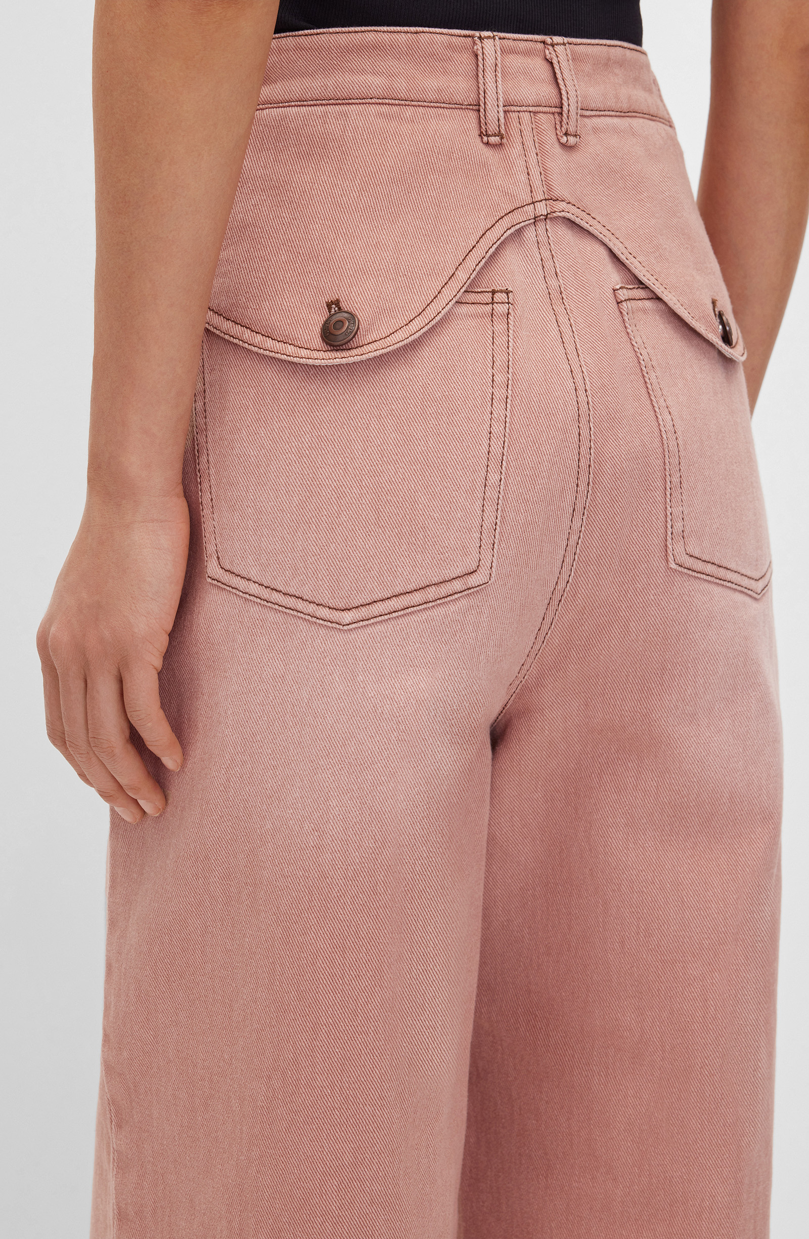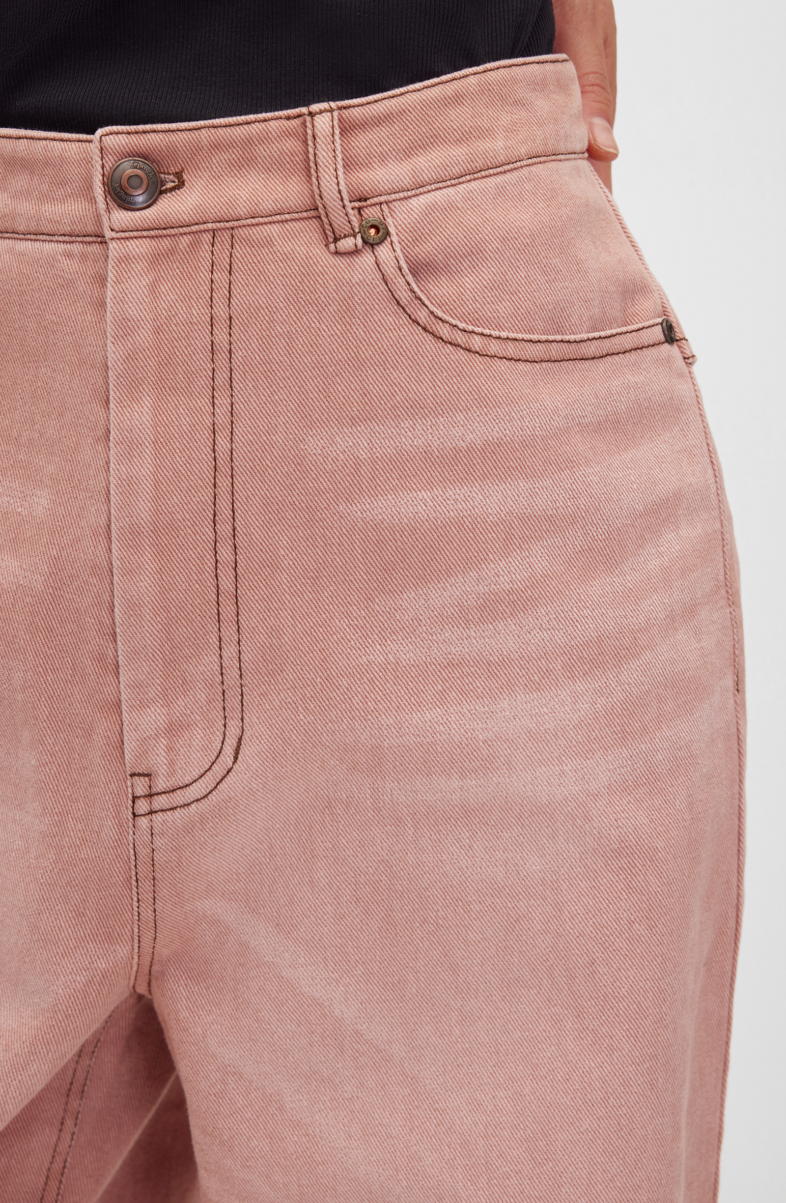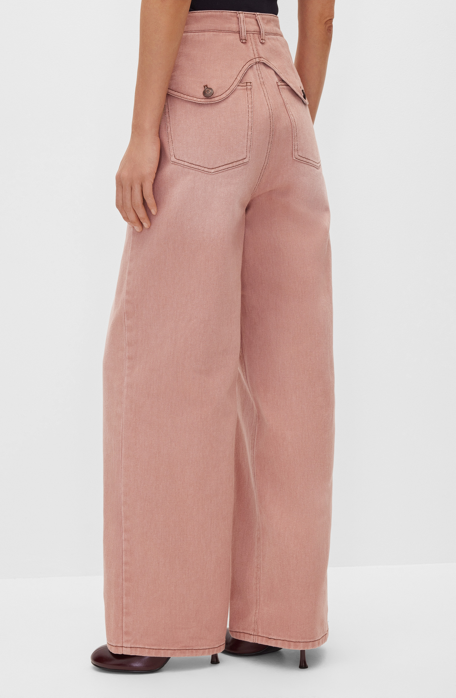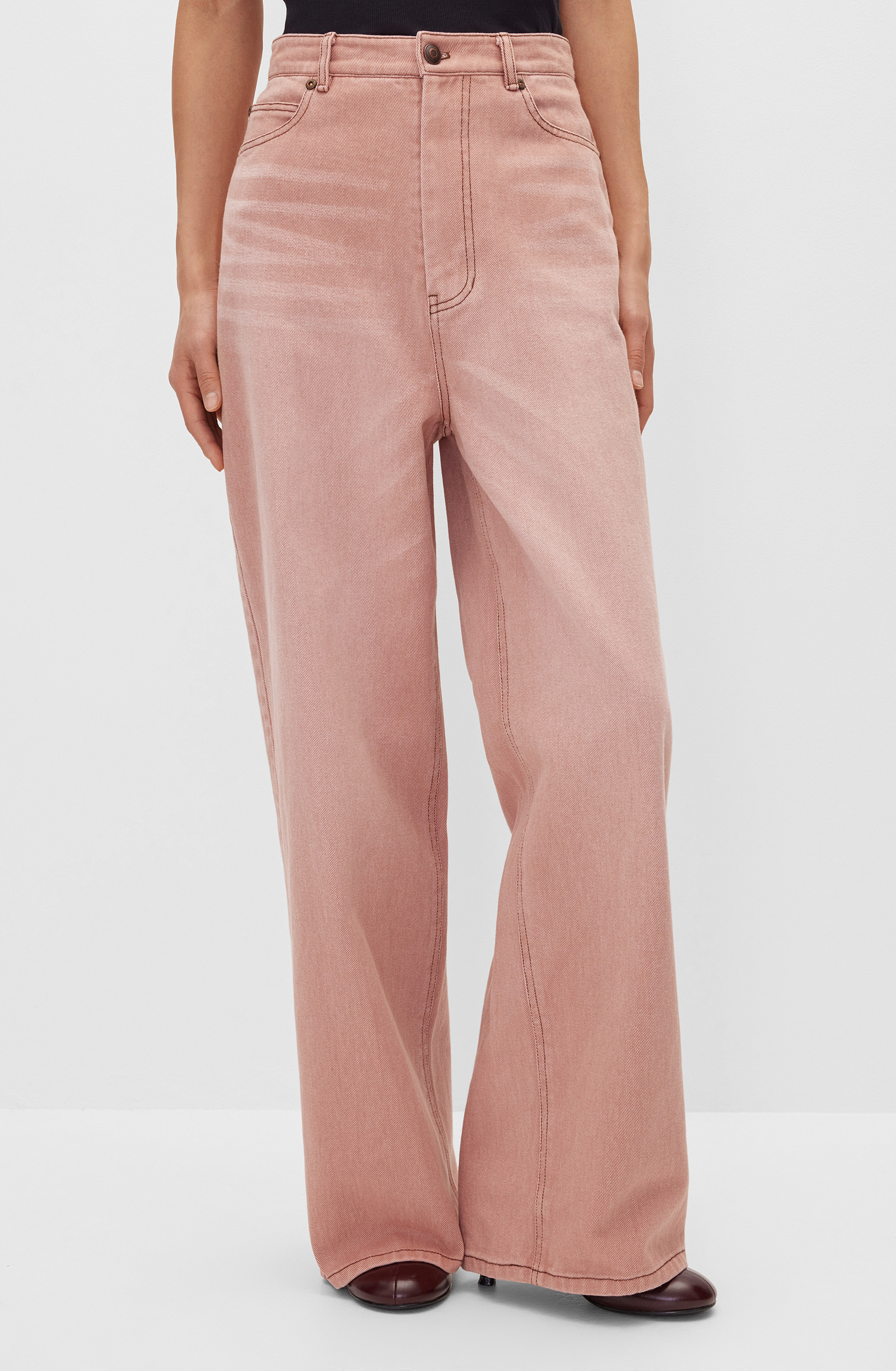 Джинсы свободного кроя с пятью карманами с застежкой на центральную переднюю молнию и металлическую пуговицу-болт. Дизайн подчеркнут прямыми широкими от бедра брючинами в пол и оригинальным декором задних карманов на кокетке и пуговицах. Средняя посадка формирует современный силуэт. Модель выполнена из хлопкового денима средней плотности, удобного в ношении и приятного к коже. Текстура ткани помогает создать расслабленный силуэт. Джинсы станут частью повседневного гардероба, создавая комбинации с топами, рубашками, джемперами, водолазками и кардиганами. Хорошо подойдут для расслабленного отдыха и прогулок по городу, предлагая комфорт и стиль в любой ситуации.