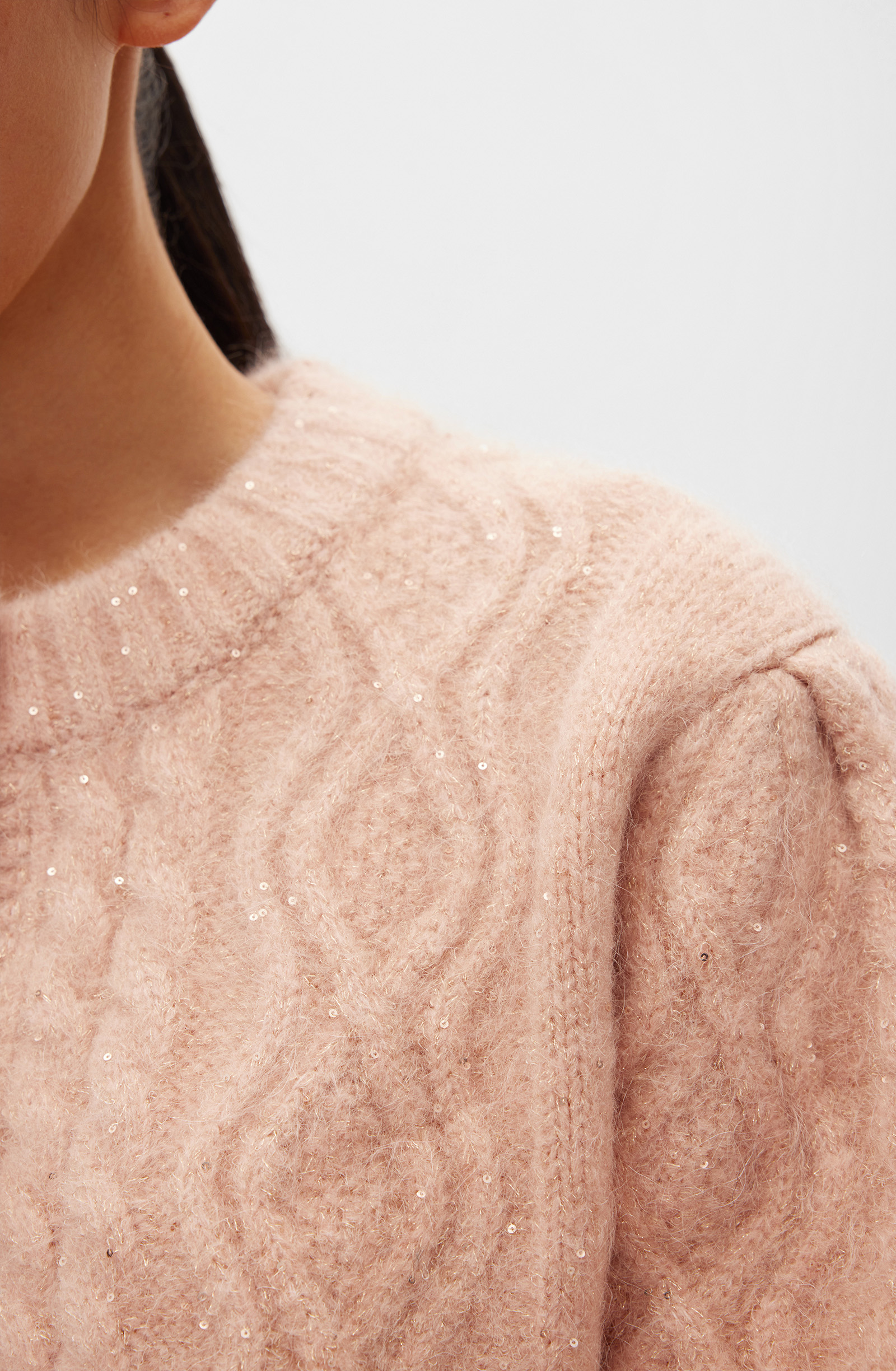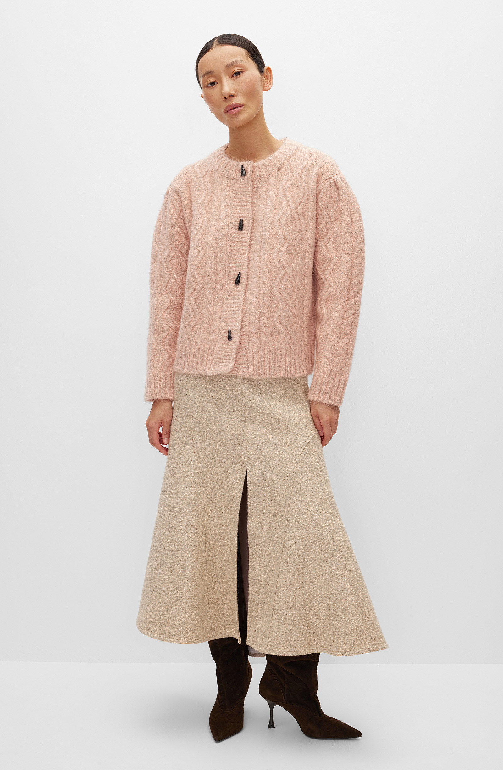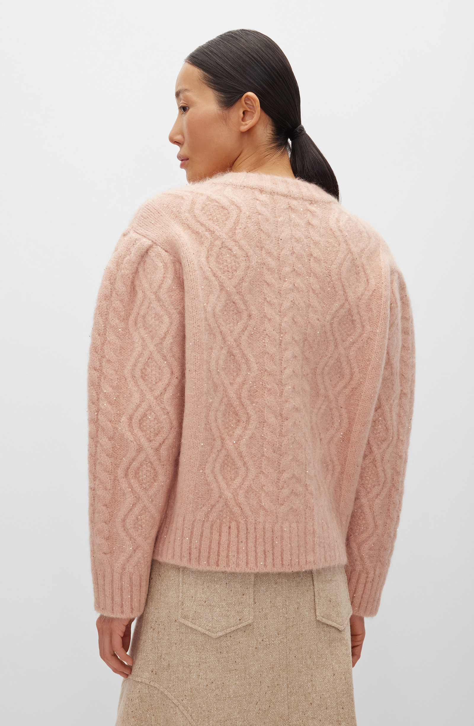 Объемный кардиган прямого кроя с приспущенными длинными рукавами и акцентированной пуговичной планкой. Широкие манжеты, округлая горловина и нижний край выполнены эластичной вязкой для комфортной посадки. Фактурный узор с арановым мотивом делает образ уютным и нарядным. Выполненный из пряжи с добавлением шерсти, этот кардиган приятно ощущается на теле и хорошо сохраняет тепло, но не перегревает. Изысканное мерцание пайеток позволяет модели стать частью выходного образа. Кардиган органично завершит любой комплект. Его легко комбинировать с юбками миди и макси, джинсами и брюками, свободными платьями и топами.