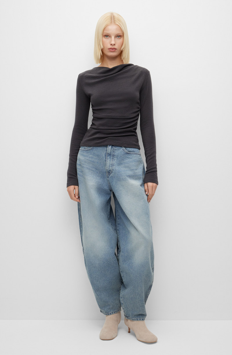 Лонгслив облегающего кроя из эластичного трикотажа. Модель с воротником-хомутом, плавно переходящим в линию плеча, и длинными рукавами. Приталенный силуэт мягко подчеркивает контуры фигуры. Аккуратная отстрочка по краям и прямой низ до середины бедра завершают лаконичный дизайн. Трикотажное полотно из тенселя с добавлением шерсти обладает высокой пластичностью и способностью сохранять форму. Эластичные волокна в составе гарантируют идеальное облегание и свободу движений. Лонгслив сочетается с брюками-палаццо и юбками-трапециями, кожаными жилетами и джинсами с завышенной талией. Гармонирует с платьями-сарафанами и комбинезонами. Нейтральный цвет и облегающий крой делают лонгслив базовым элементом для создания современных городских образов.