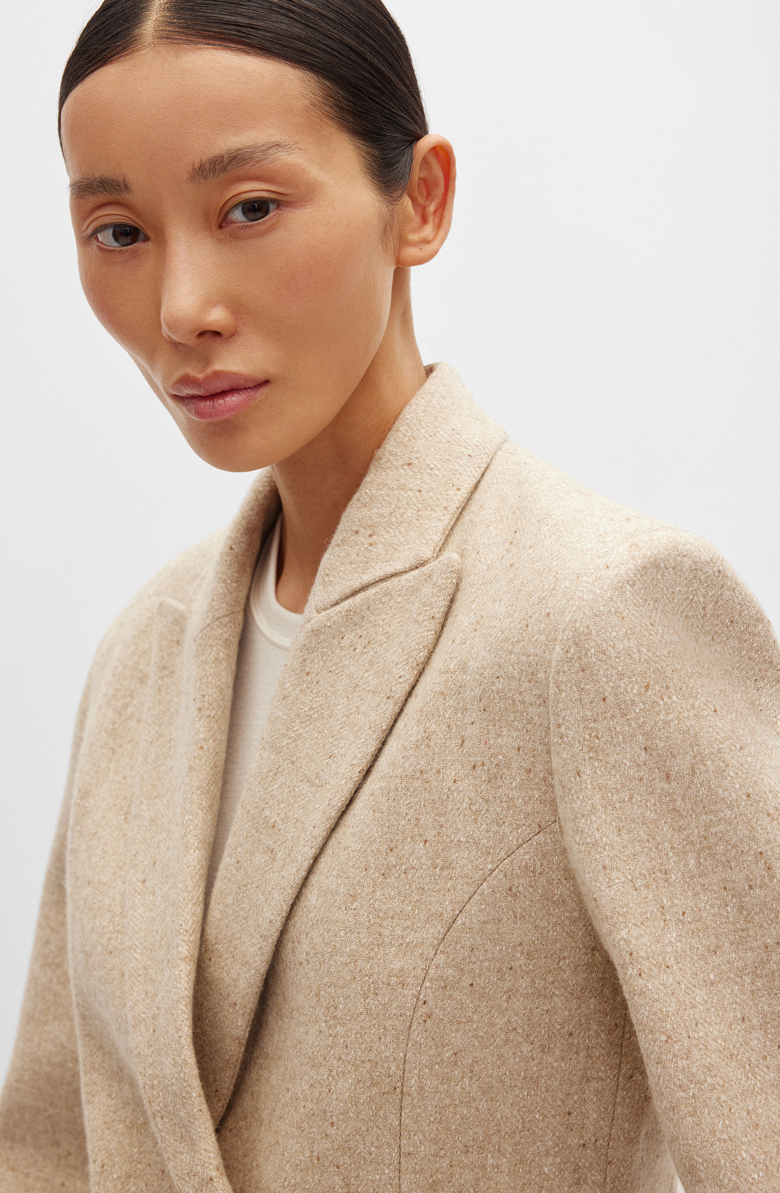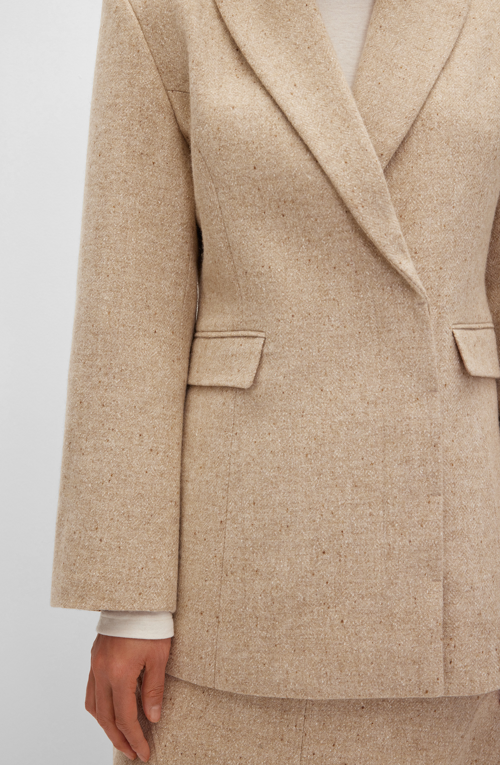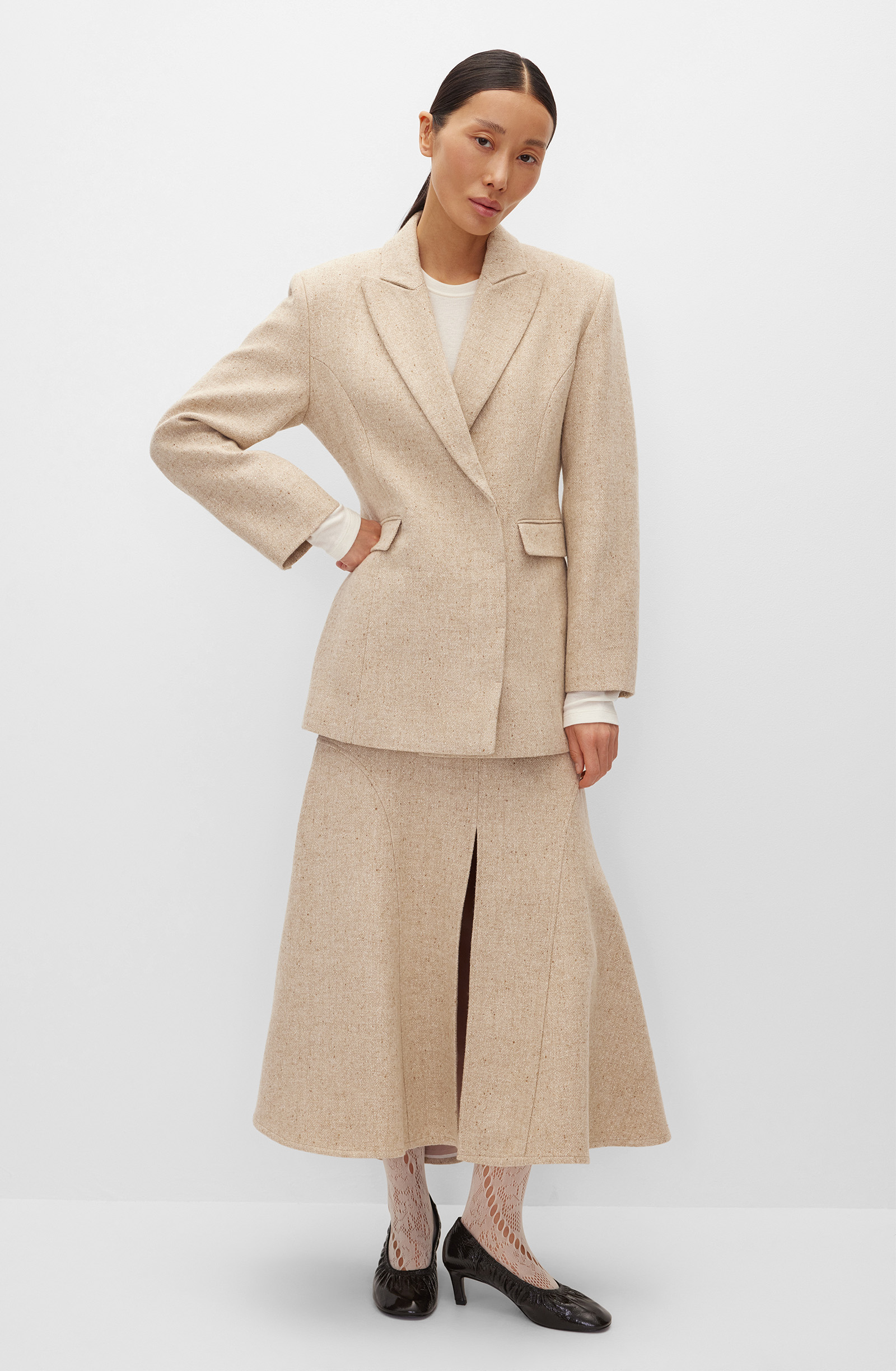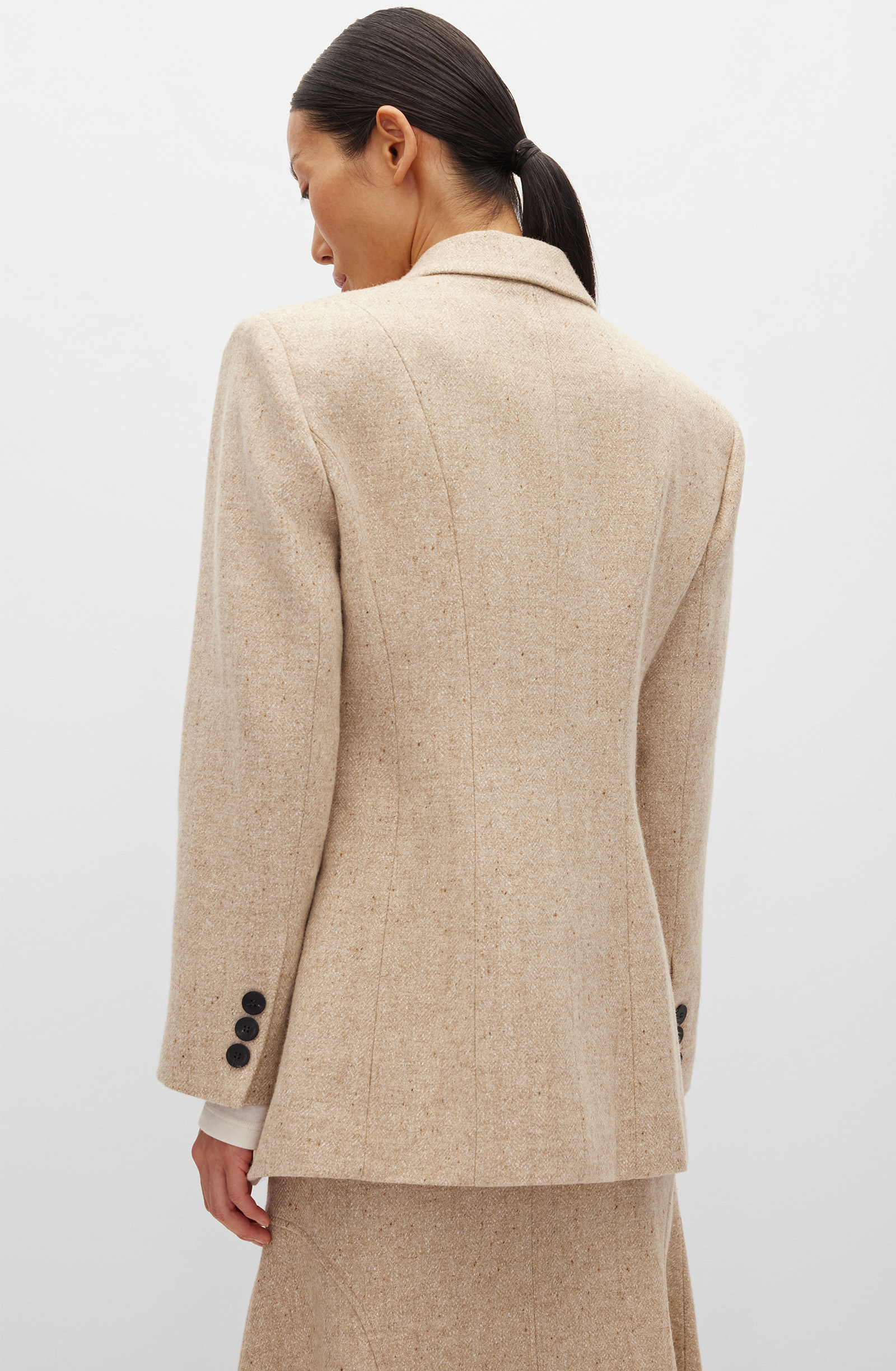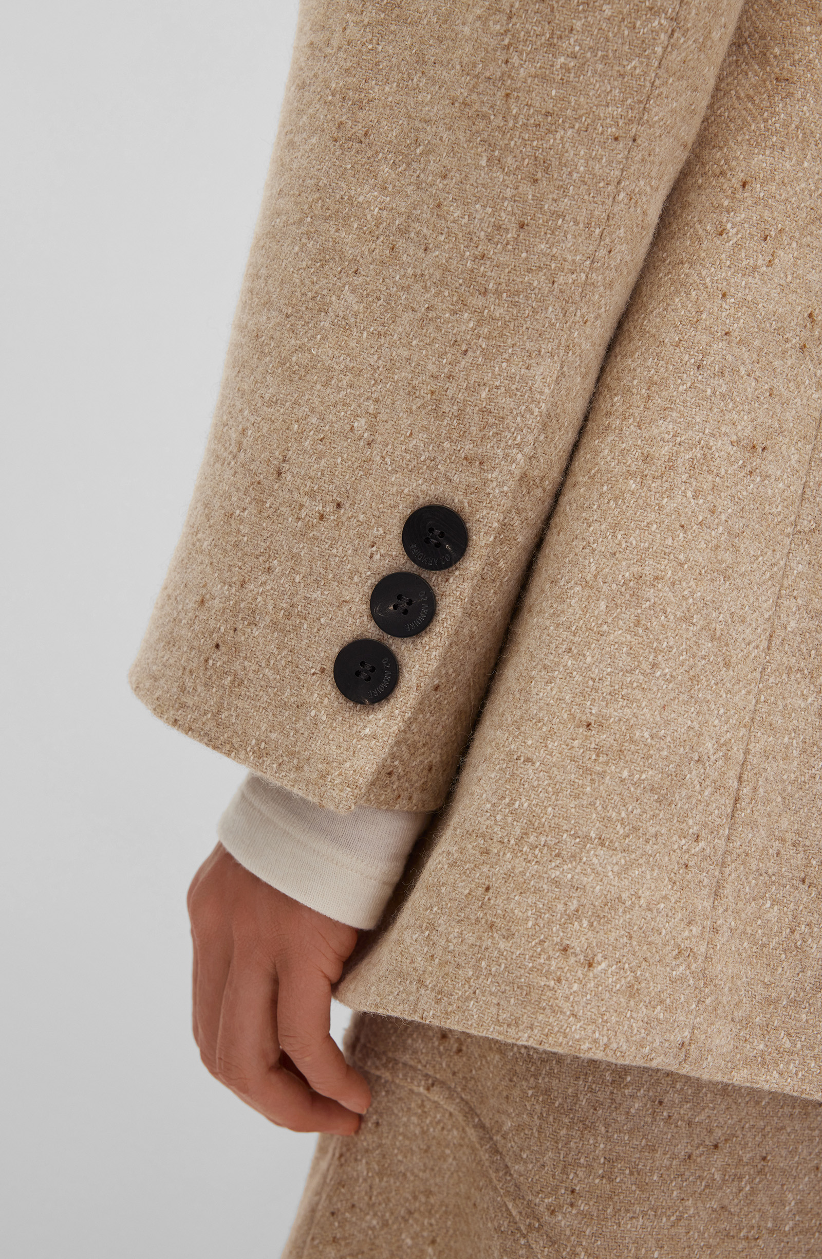 Двубортный жакет слегка приталенного силуэта подчёркивает линию плеч и выполнен с округлым вырезом горловины. Втачные рукава стандартной длины дополнены расклёшенными у запястья манжетами, что придаёт образу утончённость. Края, борта и вырез оформлены тесьмой, а контрастные пуговицы в два ряда создают выразительный акцент. Длина изделия чуть выше линии бедра делает силуэт лёгким и пропорциональным. Материал средней плотности с мягкой бархатистой фактурой приятен на ощупь, хорошо держит форму и согревает в прохладные дни. Шелковистая подкладка поддерживает аккуратную посадку и ощущение комфорта на протяжении всего дня. Такой жакет станет неотъемлемой частью демисезонного гардероба и при необходимости заменит лёгкую куртку или ветровку. Он гармонично сочетается с джинсами, классическими платьями, прямыми юбками и брюками, позволяя создавать разные варианты повседневных и более собранных образов.