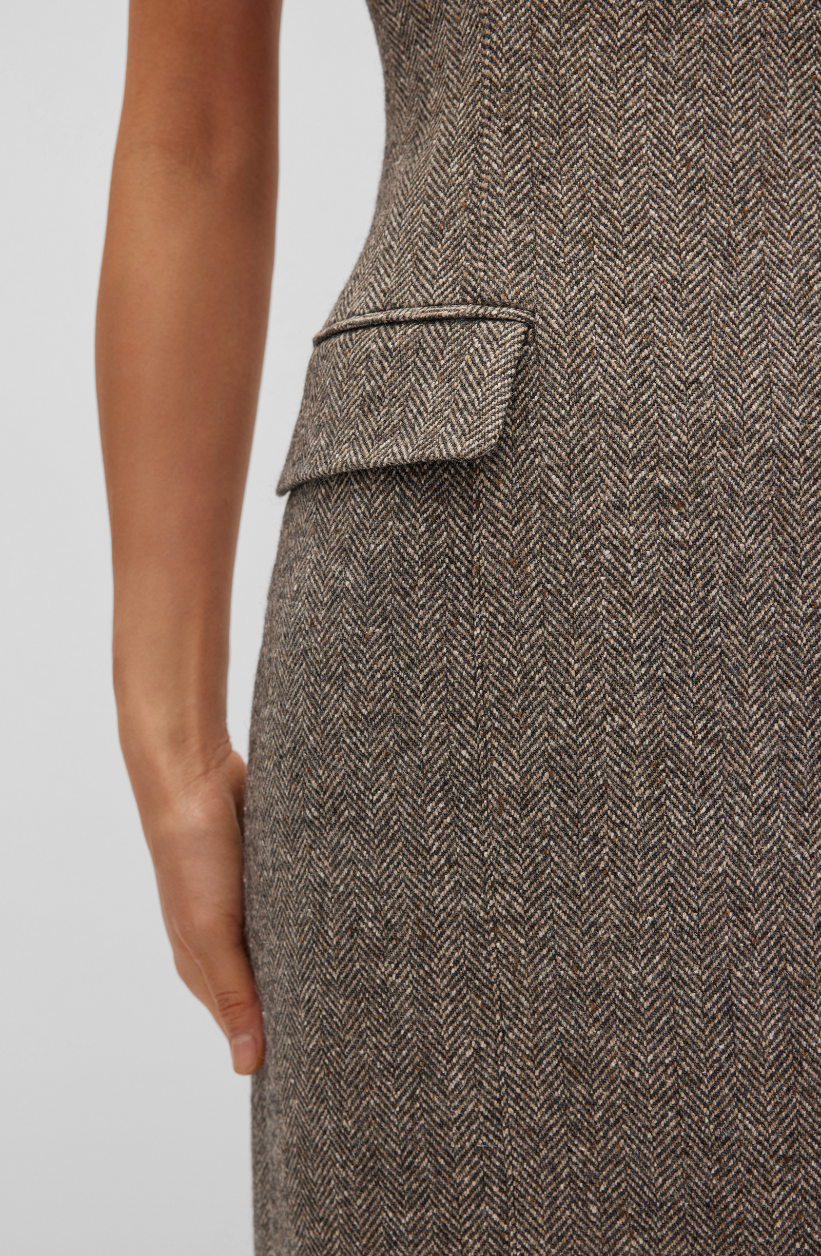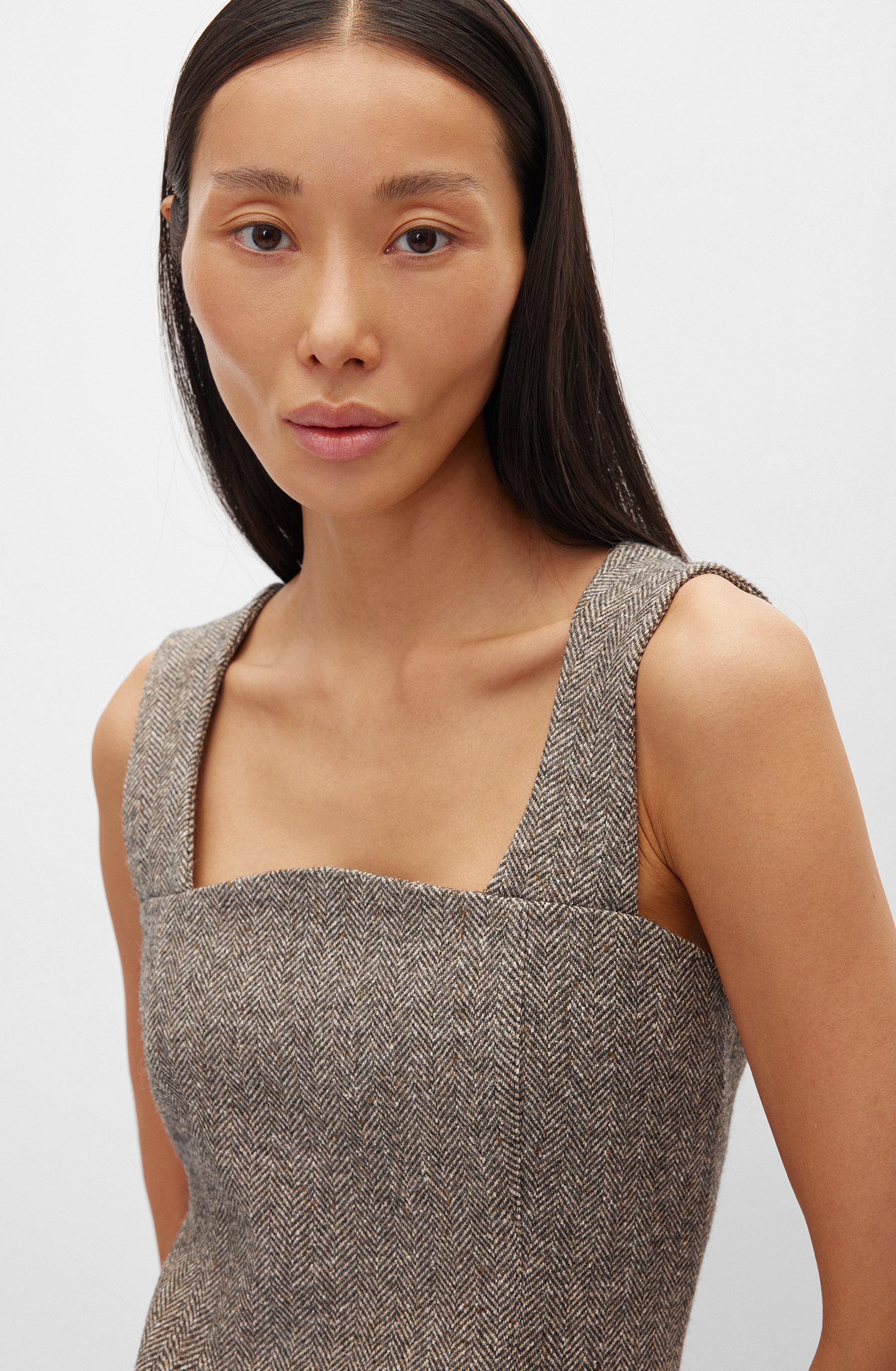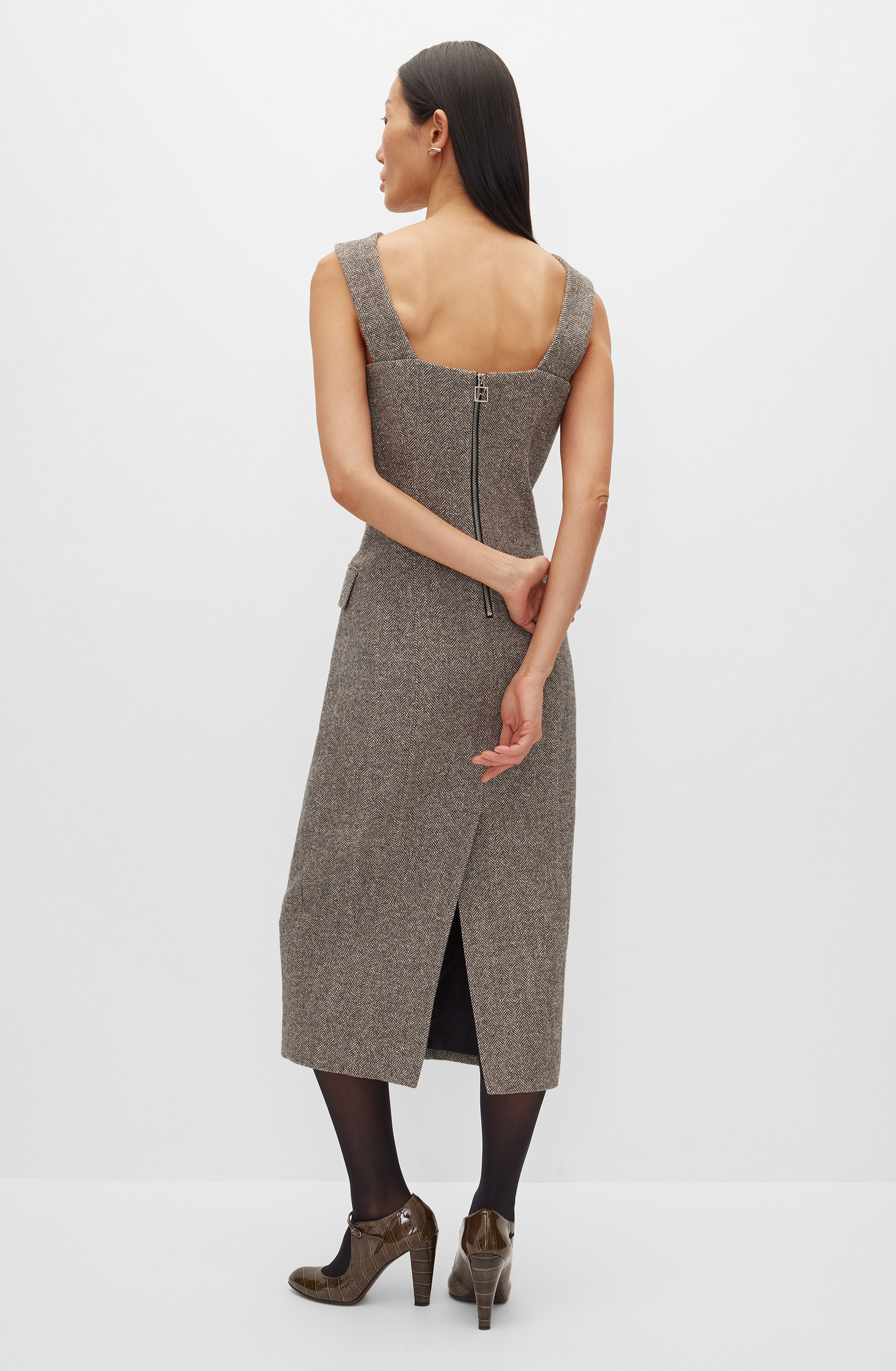 Платье-бандо приталенного кроя с декоративными элементами. Прилегание верхней части обеспечено вытачками в области груди и спинки. Длина модели — ниже колена. Застегивается на молнию в центре спинки, там же расположен разрез для удобства ходьбы. Платье выполнено из ткани с добавлением шерсти. Материал средней плотности надежно удерживает тепло и позволяет коже свободно дышать. Приятная к телу подкладка сохраняет форму изделия и обеспечивает комфорт в носке. Платье органично дополнит модный осенне-зимний гардероб. Комбинация с блузками, футболками и тонкими водолазками позволит создавать повседневные и праздничные комплекты.
