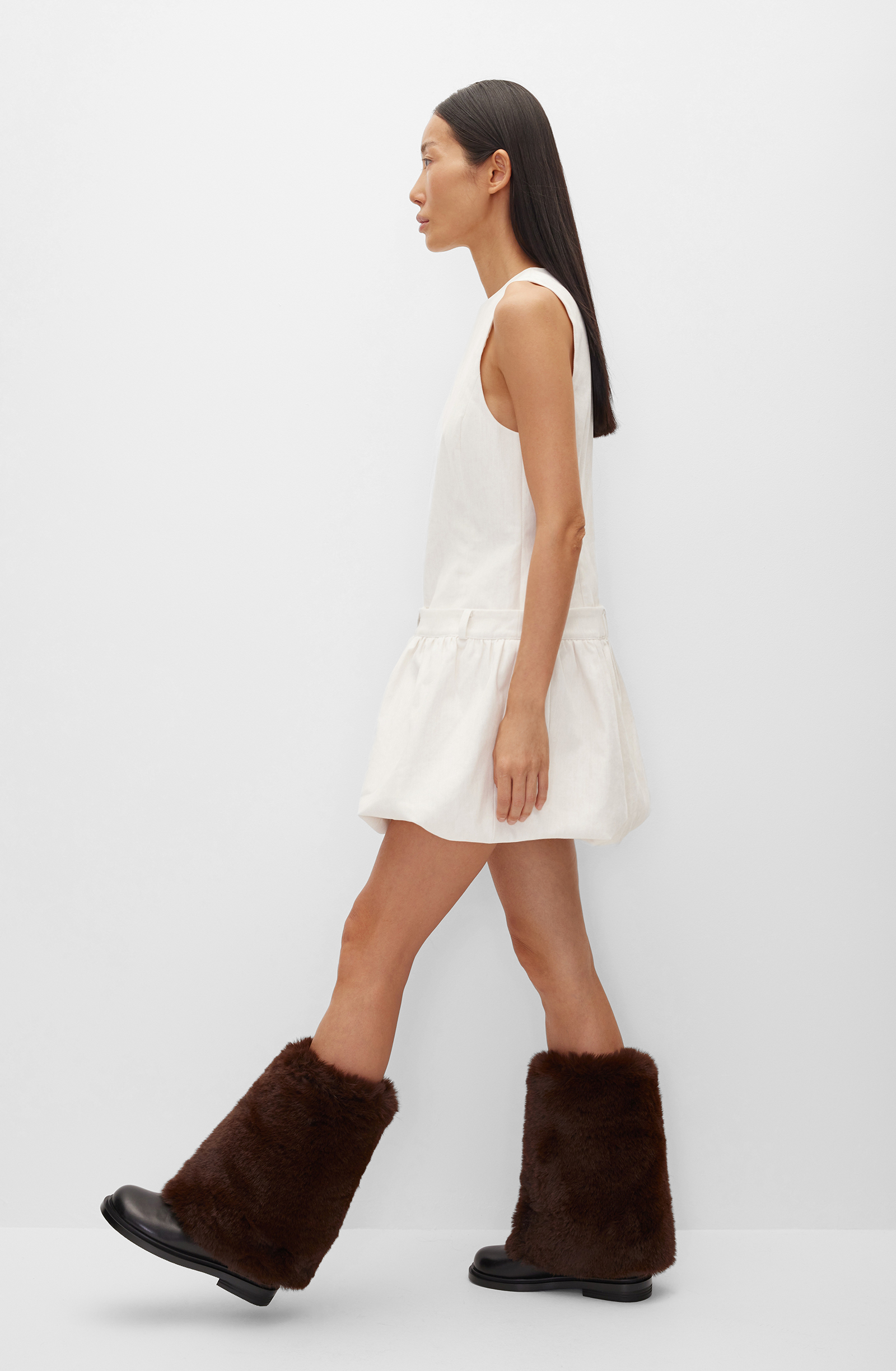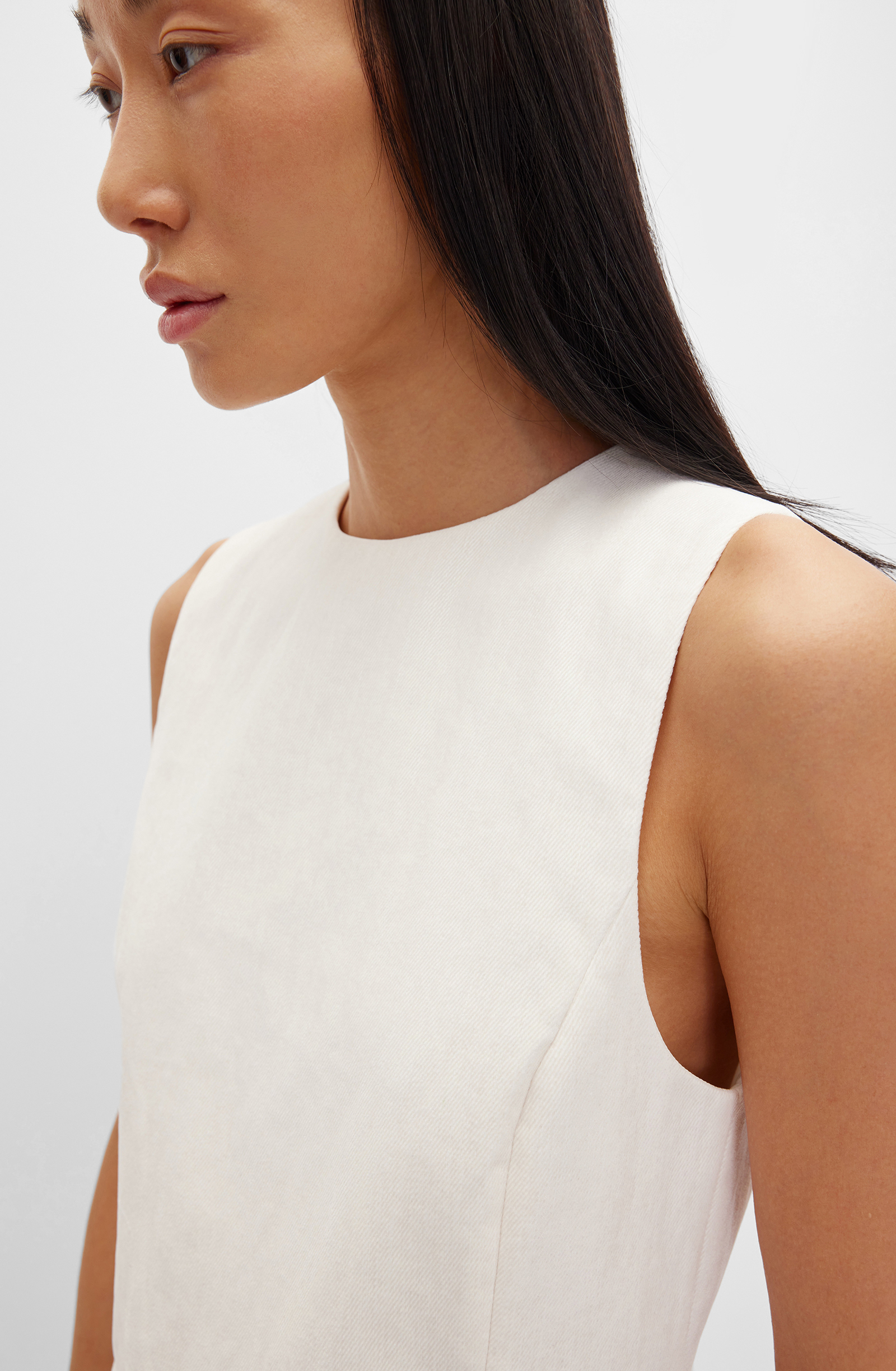 Мини-платье А-силуэта сочетает изысканность и современный шик. Имитация пышной юбки с поясом в области бедер добавляет образу динамики и шарма. Потайная застежка-молния в центральном шве спинки и боковые вытачки корректируют силуэт. Конструктивная особенность модели — глубокая пройма рукавов. Шлевки позволяют продеть ремень. Изготовленное из мягкой хлопковой ткани средней плотности, платье красиво облегает фигуру. Приятный к телу материал хорошо держит форму и поддерживает комфорт в течение дня. Подкладка способствует точной посадке по фигуре. Отсутствие рукавов делает платье идеальным выбором для теплого времени года. В прохладные дни его можно комбинировать с различными жакетами, кардиганами и легкими хлопковыми куртками, создавая модные городские образы.