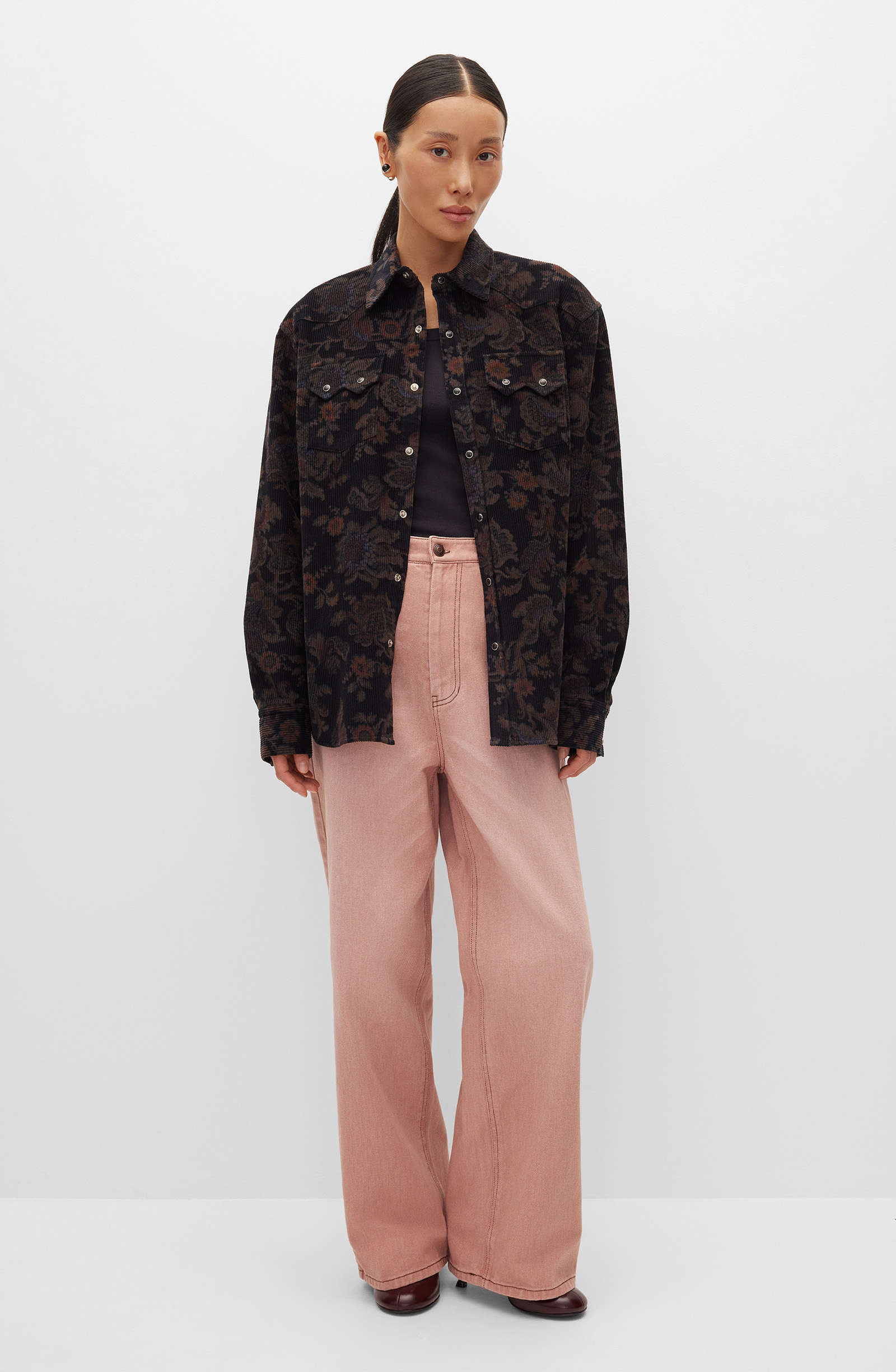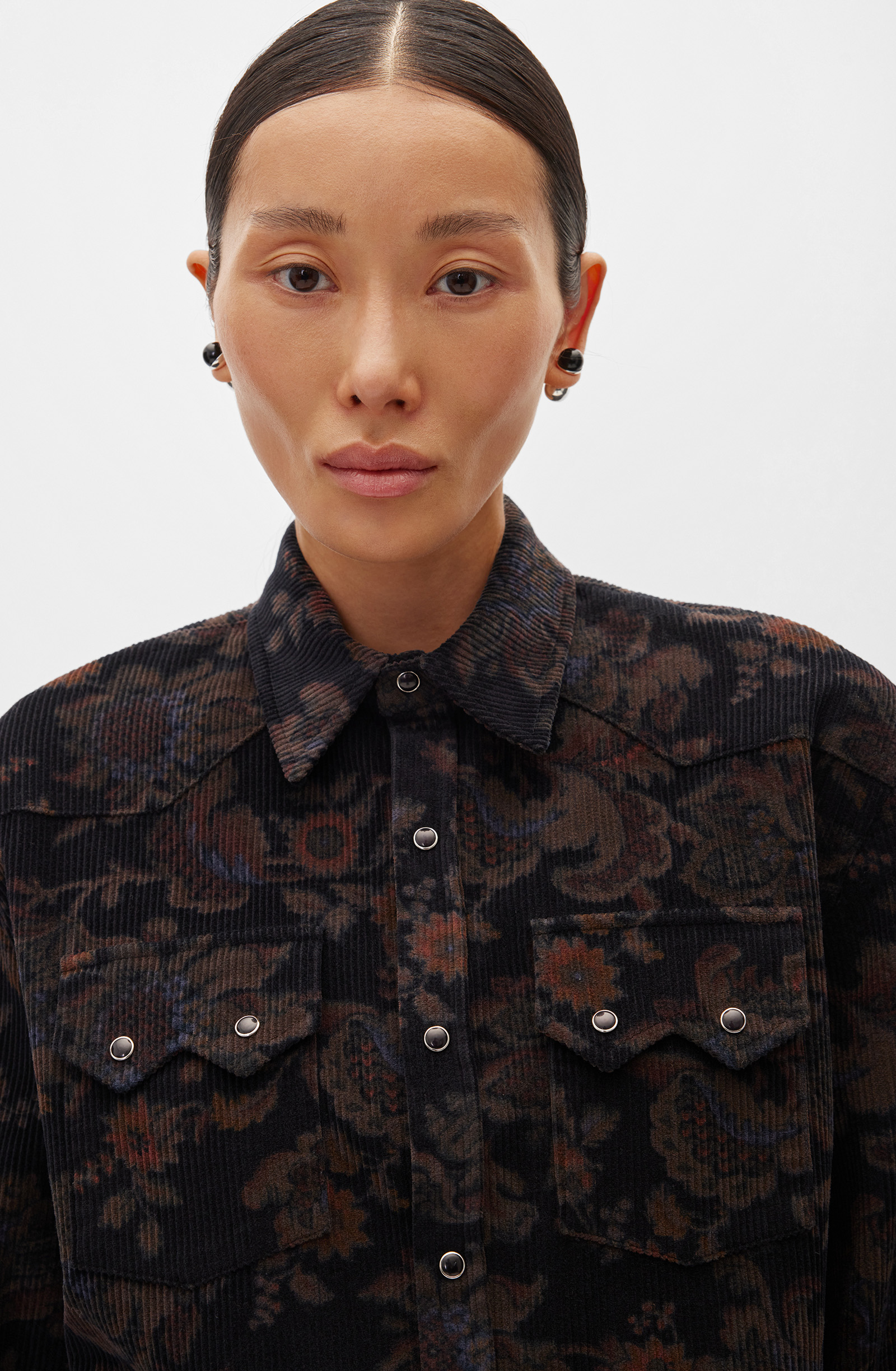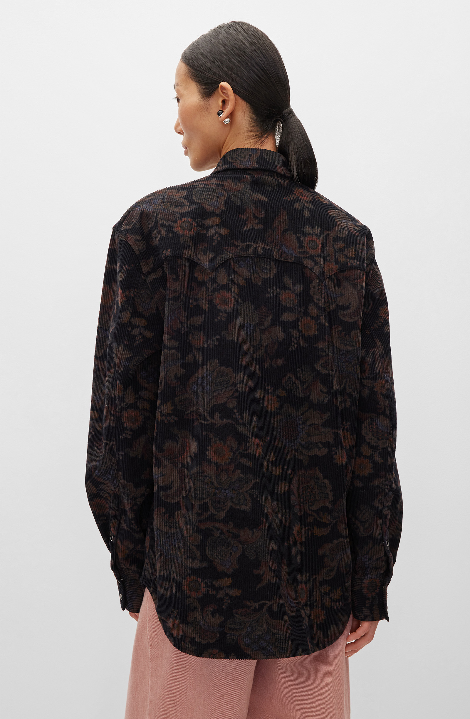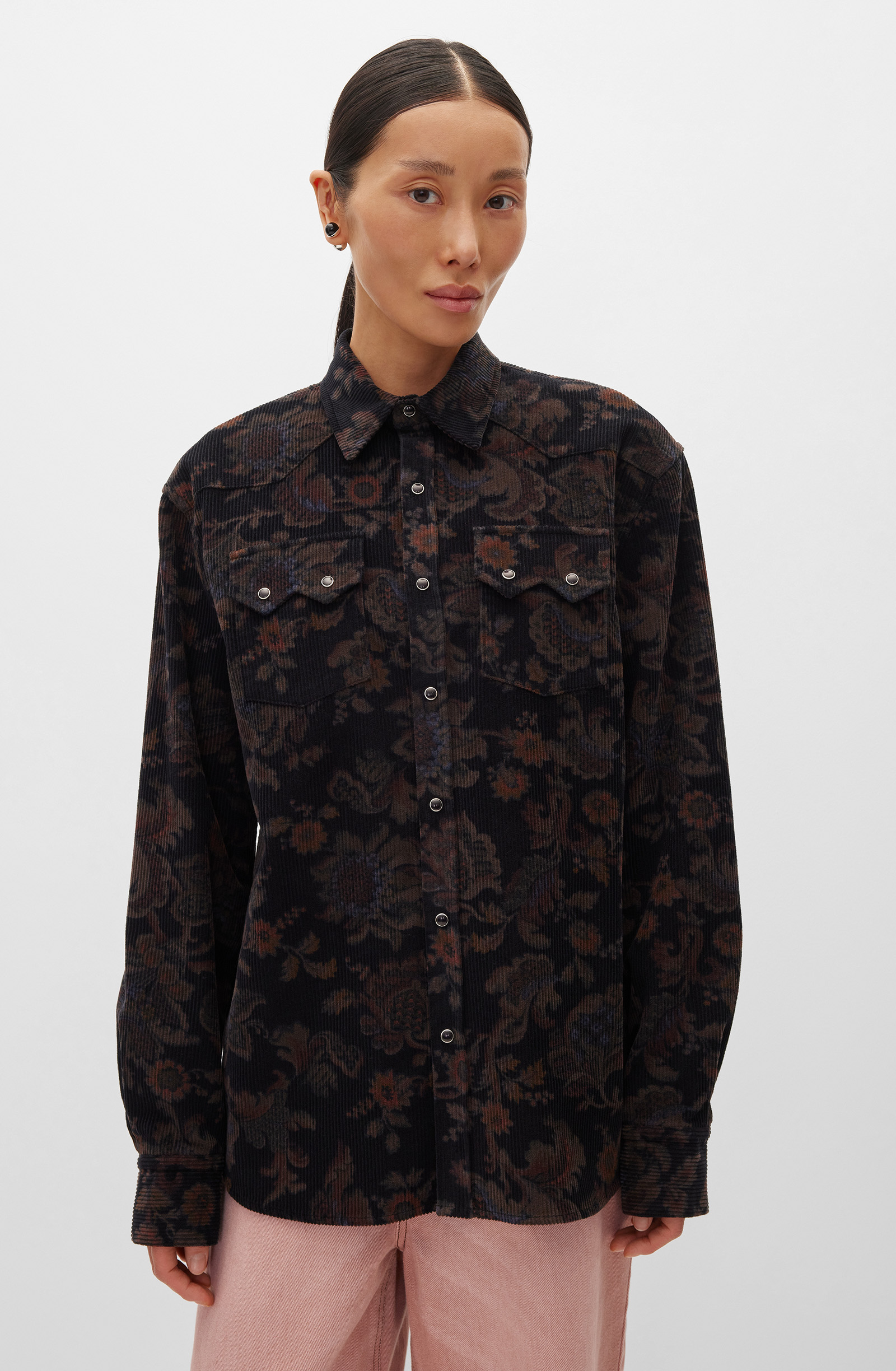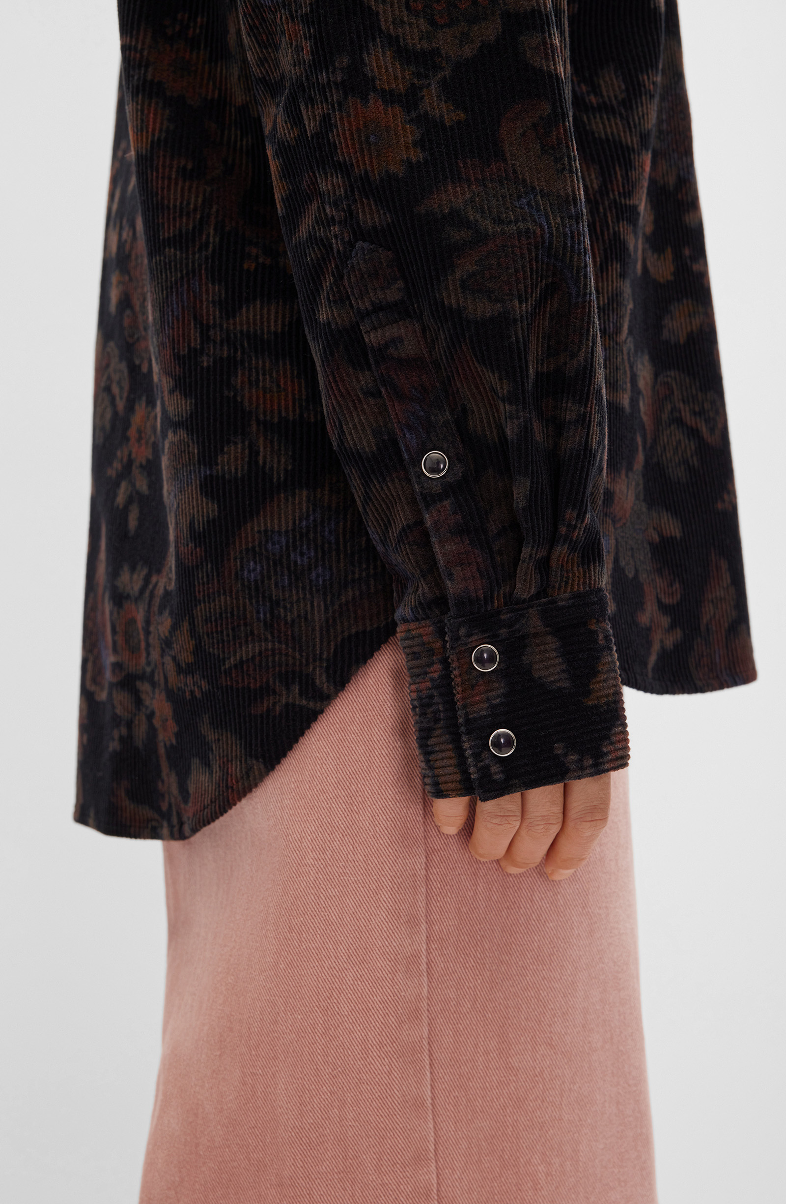 Рубашка прямого силуэта со спущенной линией плеча и остроугольным отложным воротником на стойке. Застегивается на практичные металлические кнопки. По краям рукавов притачные манжеты. Спинка со слегка закругленным низом. Передняя часть ровная. Аккуратные накладные карманы в области груди служат интересным акцентом и придают функциональность. Модель выполнена из хлопкового вельвета средней плотности. Мягкая ткань в рубчик хорошо держит форму, обеспечивает свободу движений и отлично выглядит в течение дня. Рубашка легко комбинируется с различными элементами гардероба, от платьев до легинсов и джинсов.