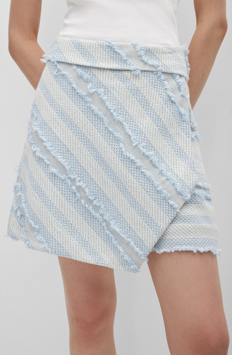 Лёгкое движение — и мини-юбка превращается в элегантные шорты. Достаточно отстегнуть асимметричный подол, чтобы образ за пару секунд сменил настроение: от дерзкого до непринуждённо-комфортного. Мягкий широкий пояс фиксирует посадку на талии, а карманы по бокам добавляют расслабленности. Воздушная бахрома мягко очерчивает линию низа и задаёт динамику движению. Ткань приятна к телу, дышит и держит форму, словно не замечая времени. Сочетайте с мужским жакетом, шёлковой блузой или простым хлопковым топом — и каждый раз это будет новая история, в которой главная героиня вы.