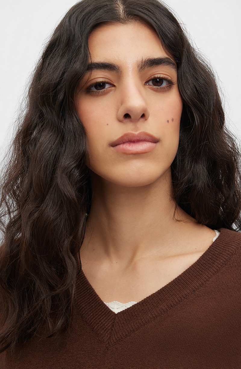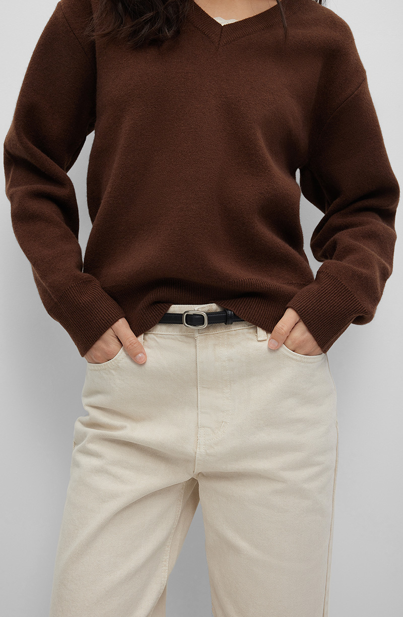 Джемпер прямого силуэта из комбинированной пряжи. Модель с V-образной линией горловины и длинными рукавами классической посадки. Отсутствие застежек подчеркивает лаконичный дизайн и обеспечивает плавные линии силуэта. Плотное трикотажное полотно с шерстью и кашемиром в составе обладает повышенными теплоизоляционными свойствами и мягкой объемной фактурой. Материал сохраняет форму, устойчив к скатыванию и отличается легкостью при плотности вязки. Базовый элемент для холодного сезона сочетается с пальто двойкой, кожаными брюками и ботинками. Хорошо смотрится под рубашку с отложным воротником и чиносами, под жилетом из твида с юбкой-плиссе и сапогами по колено. Многослойность с водолазкой и пальто-кокон создает элегантную комбинацию, а с дубленкой и джинсами-скинни — практичный городской образ.