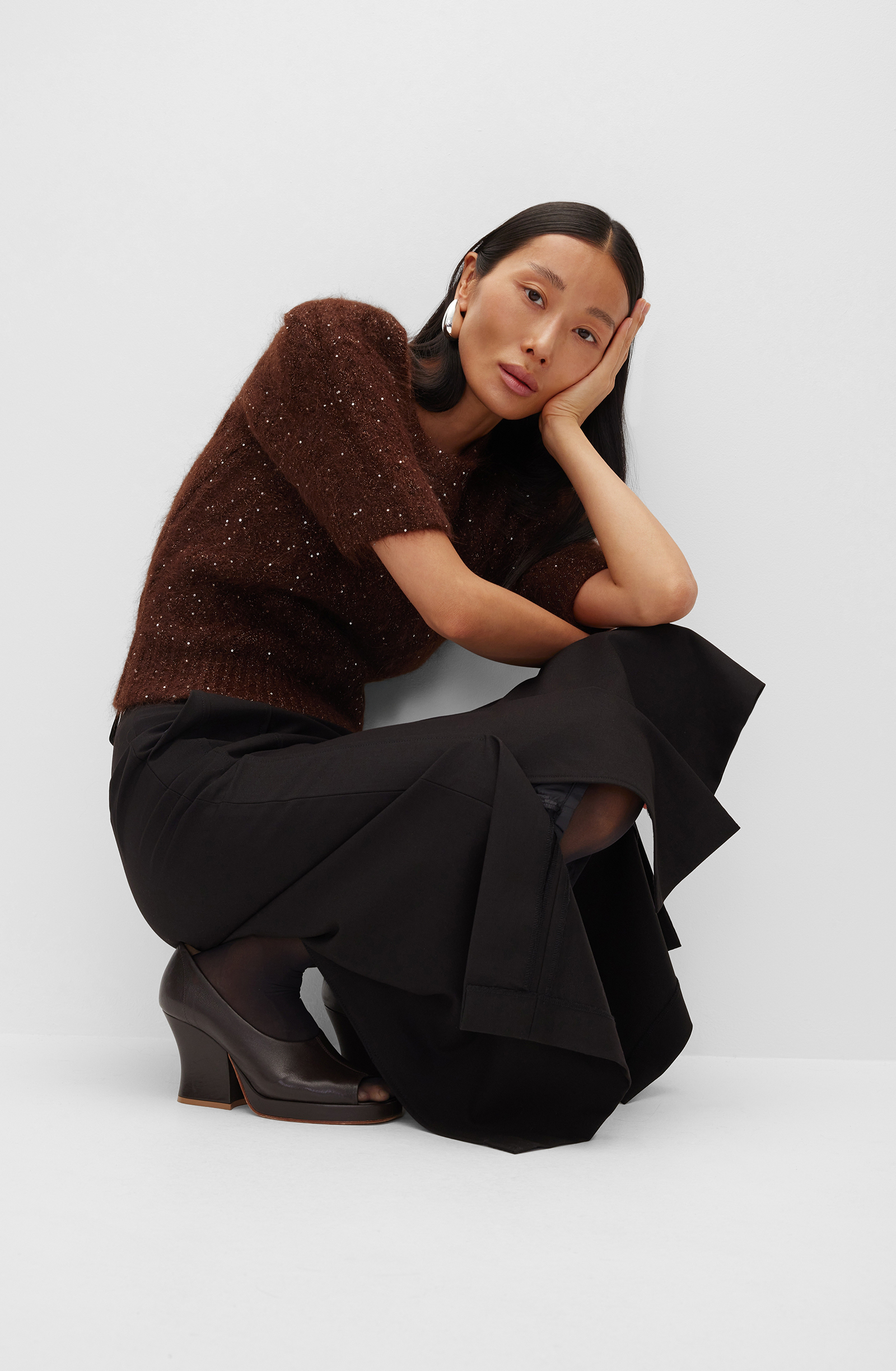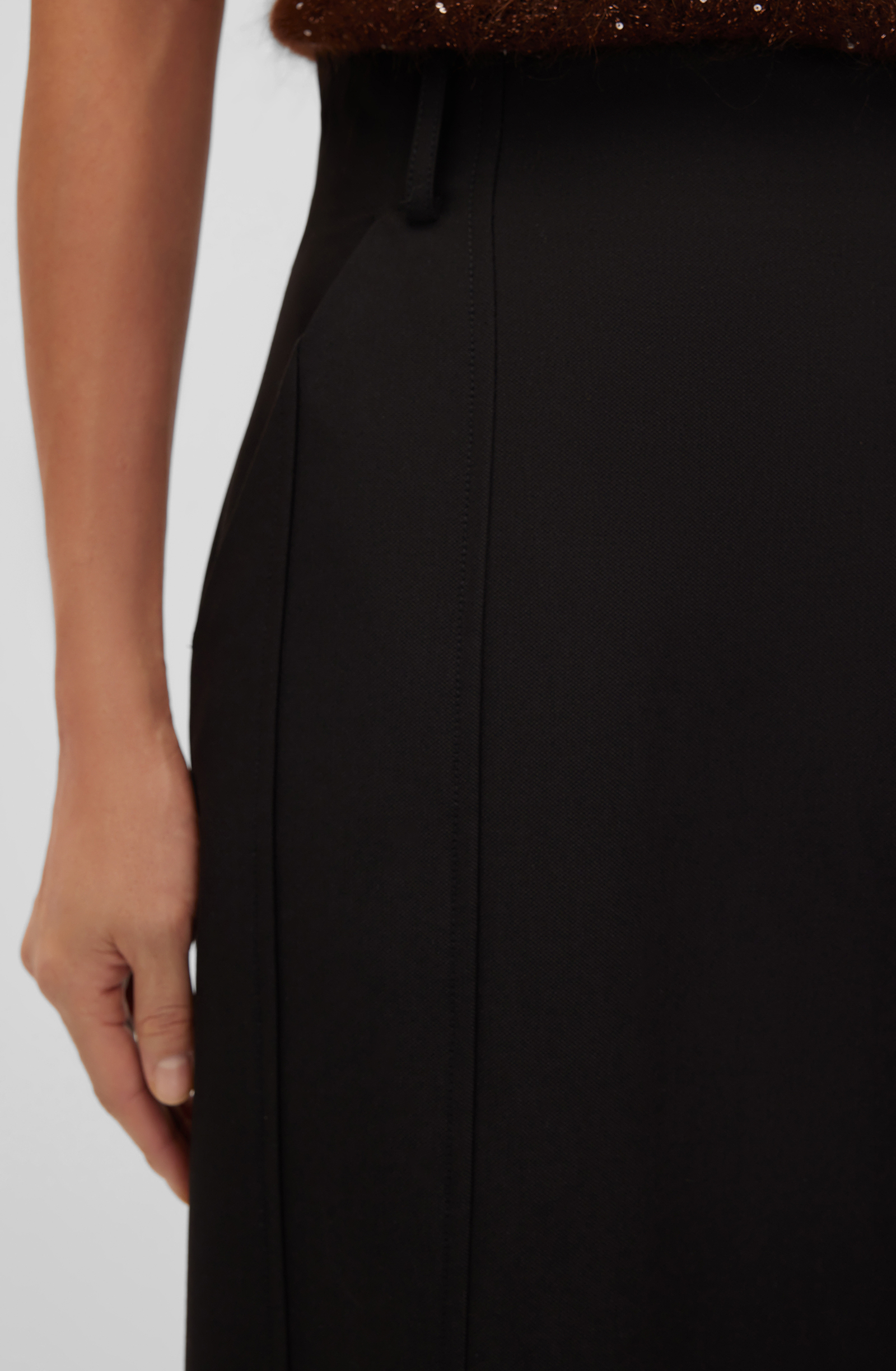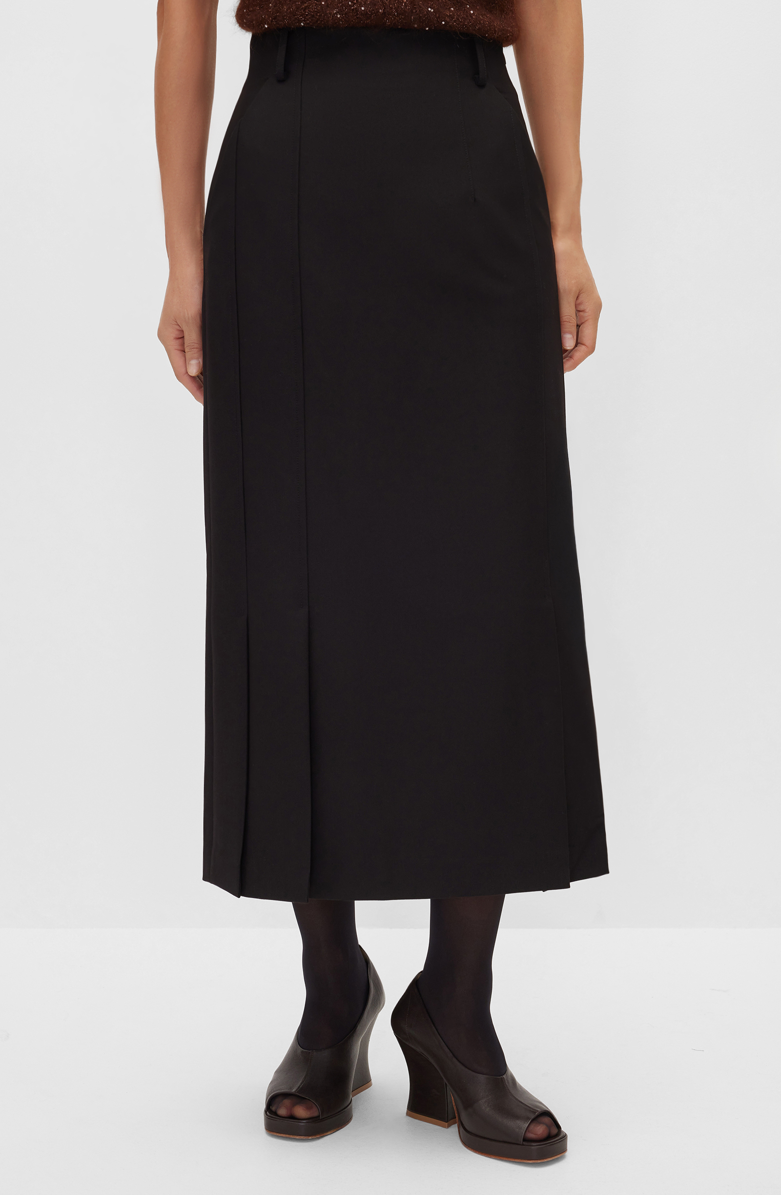 Юбка прямого силуэта с высокой посадкой и поясом со шлевками под ремень. Застегивается на потайную молнию в боковом шве. На переднем полотнище — две вертикальные складки и боковые карманы с отрезным бочком. На заднем полотнище — талиевые вытачки и средний шов с разрезом до колена. Модель выполнена из умеренно плотной и мягкой ткани, которая хорошо держит форму и сохраняет аккуратный вид в течение дня. Подкладка обеспечивает комфортную посадку и позволяет коже дышать. Юбка дополнит базовый осенне-зимний гардероб и составит органичные комплекты с топами, лонгсливами, водолазками и блузками. Для создания многослойных образов ее можно комбинировать с кардиганами и жакетами.