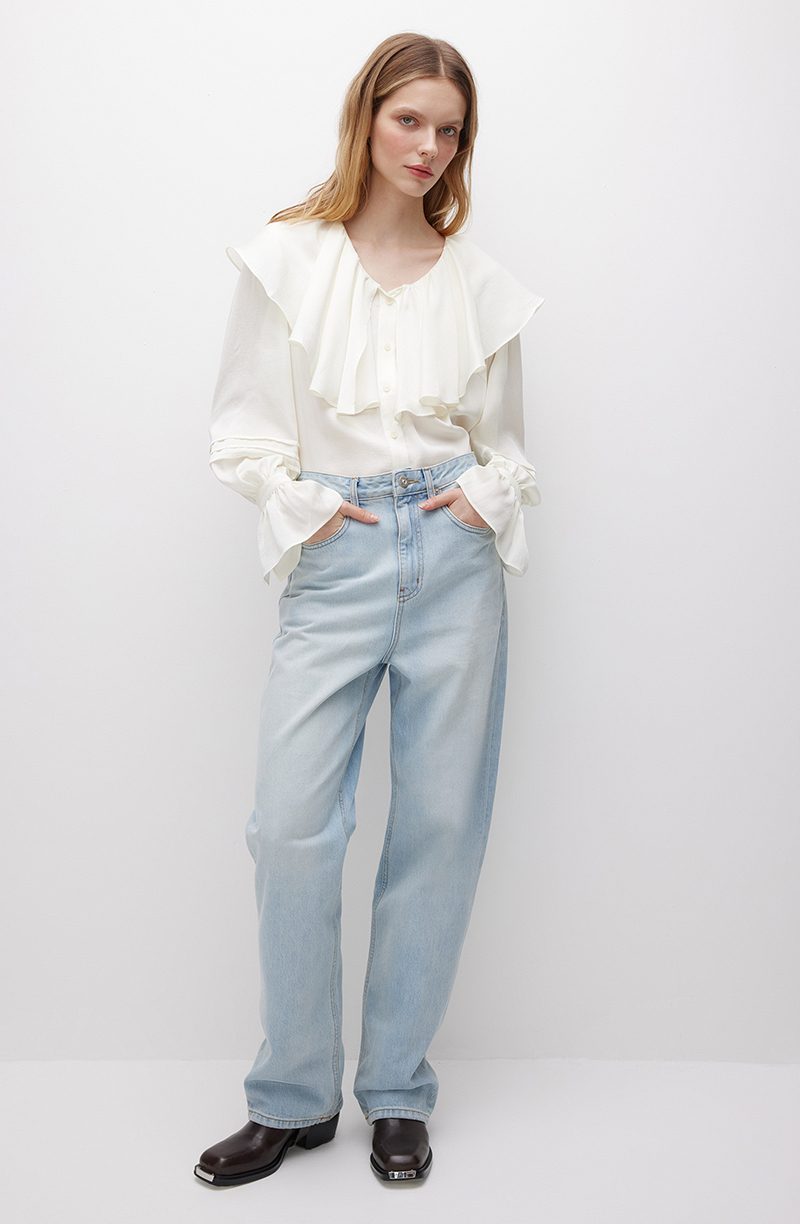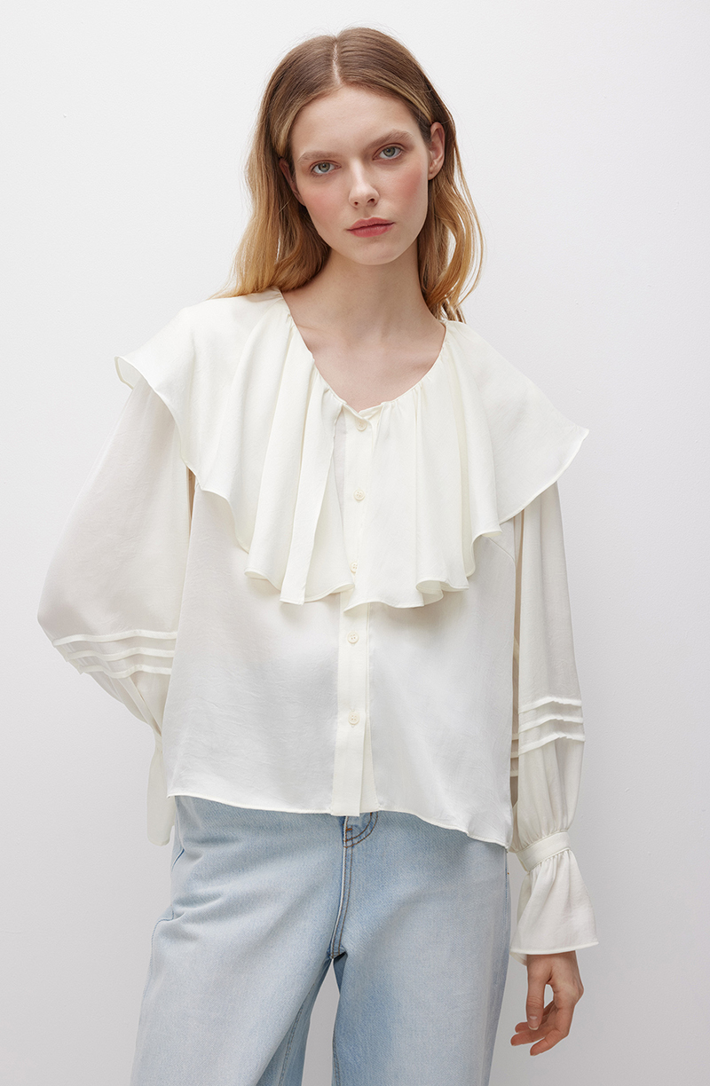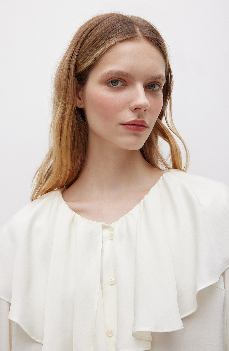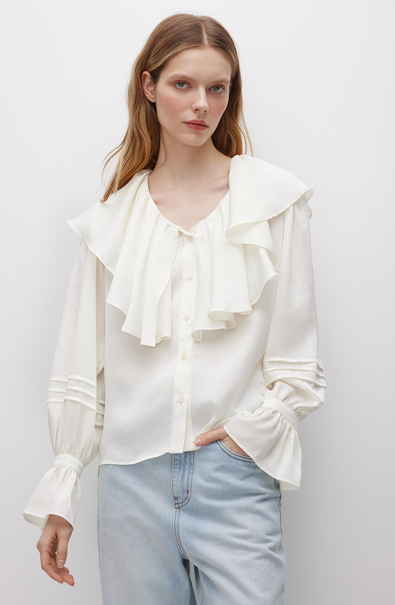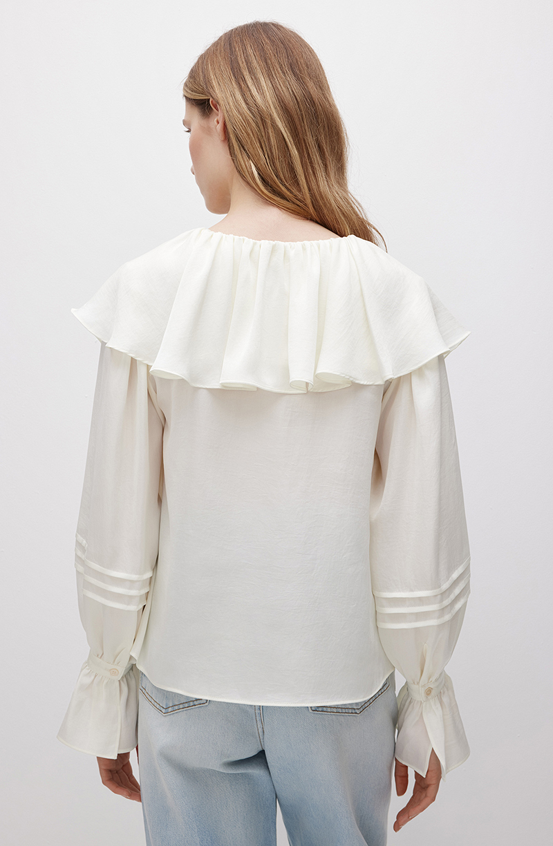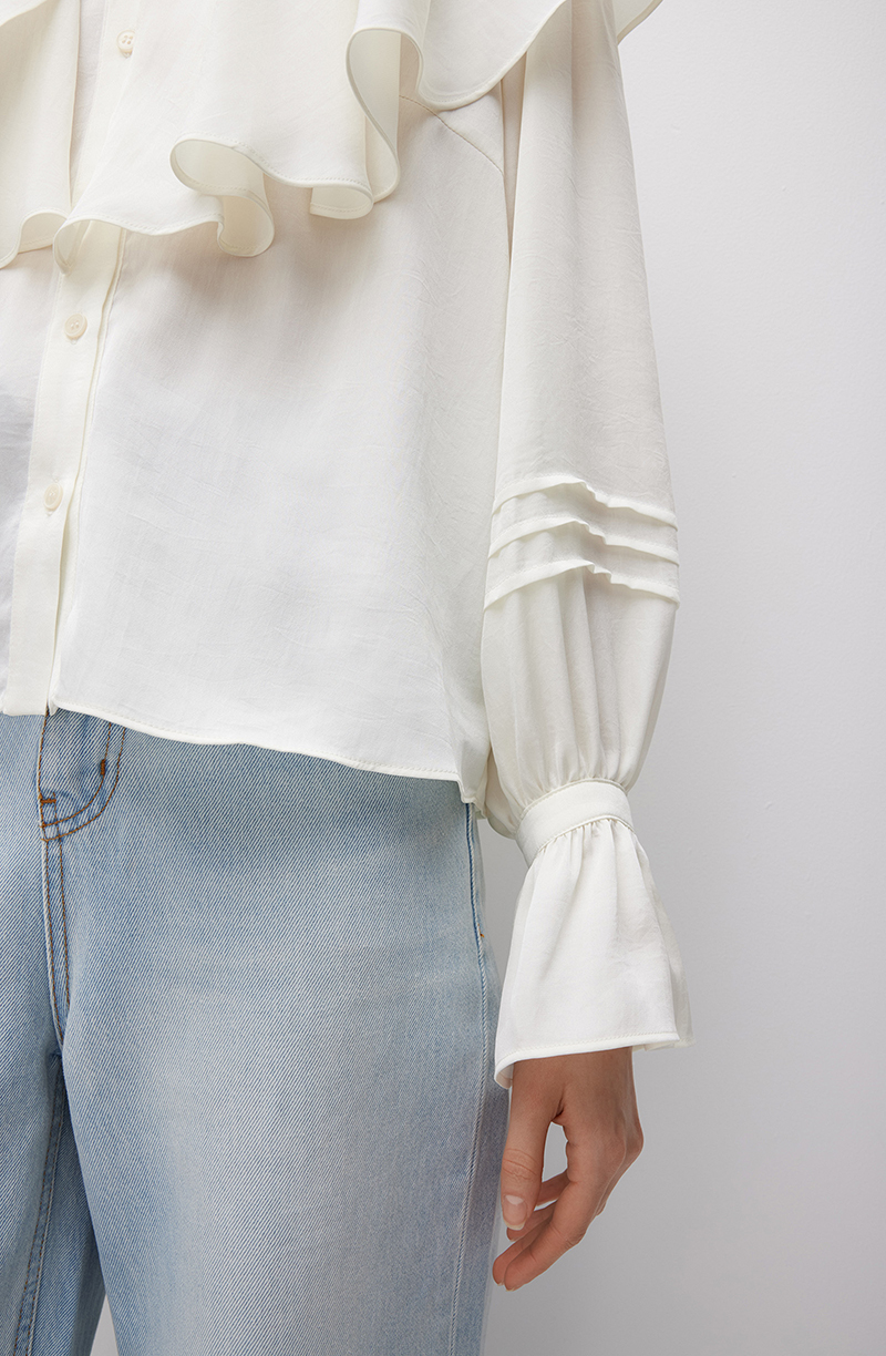 Элегантная черная блуза прямого силуэта. Застегивается впереди на ряд небольших пуговиц в цвет основной ткани. V-образный вырез декорирован воротником в виде ниспадающего мягкими фалдами волана. Широкие отрезные рукава вверху присобраны на крупные однонаправленные складки, а у манжет подхвачены тканевой лентой. Декорированы аккуратными защипами. Модель выполнена из легкой и приятной к телу ткани. Материал с гладкой фактурой отлично пропускает воздух, позволяя коже дышать. Такая блуза станет универсальным элементом гардероба, поскольку подойдет для создания самых разных образов. Ее можно комбинировать с классическими костюмами для деловых встреч или работы, с эффектными брюками и юбками для торжественных мероприятий.