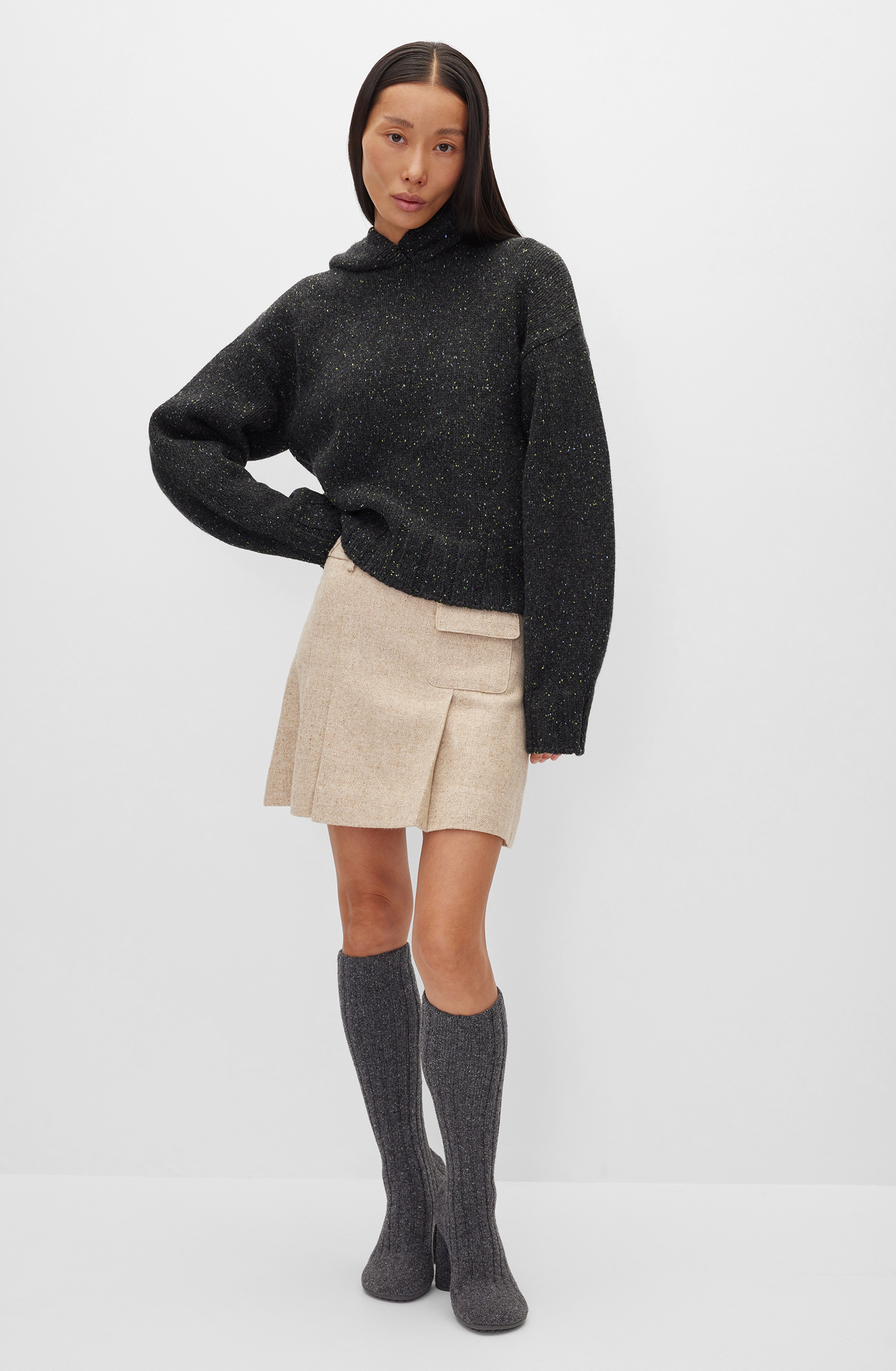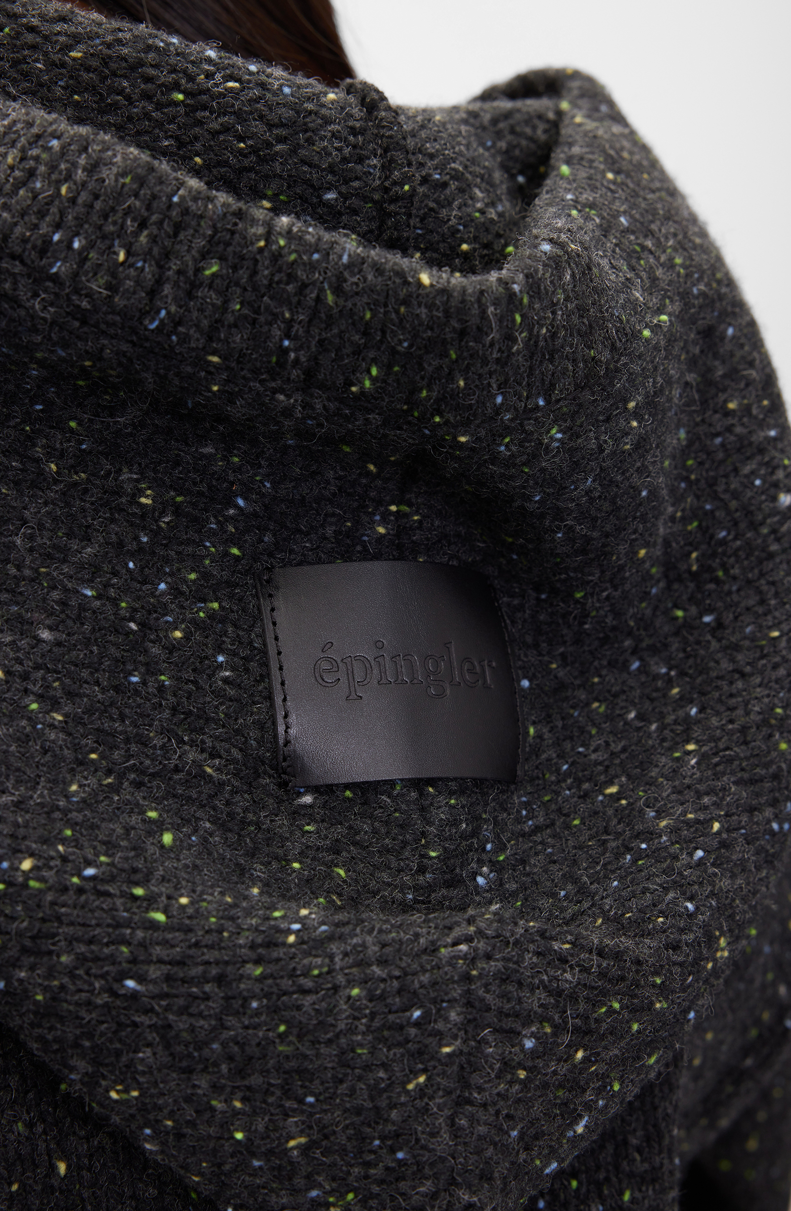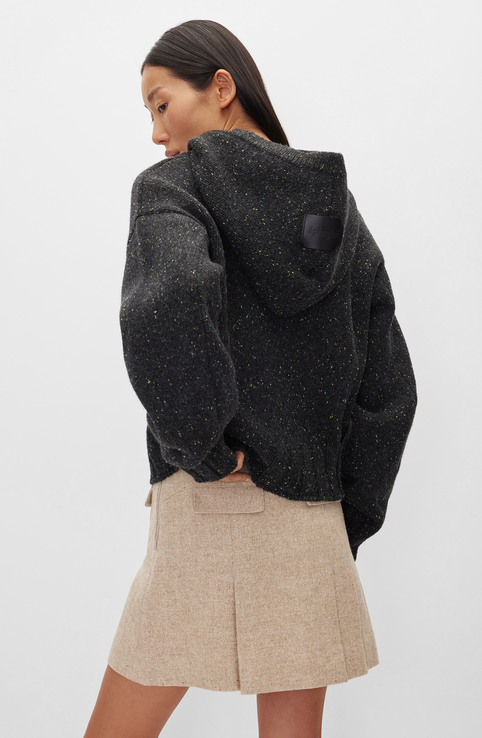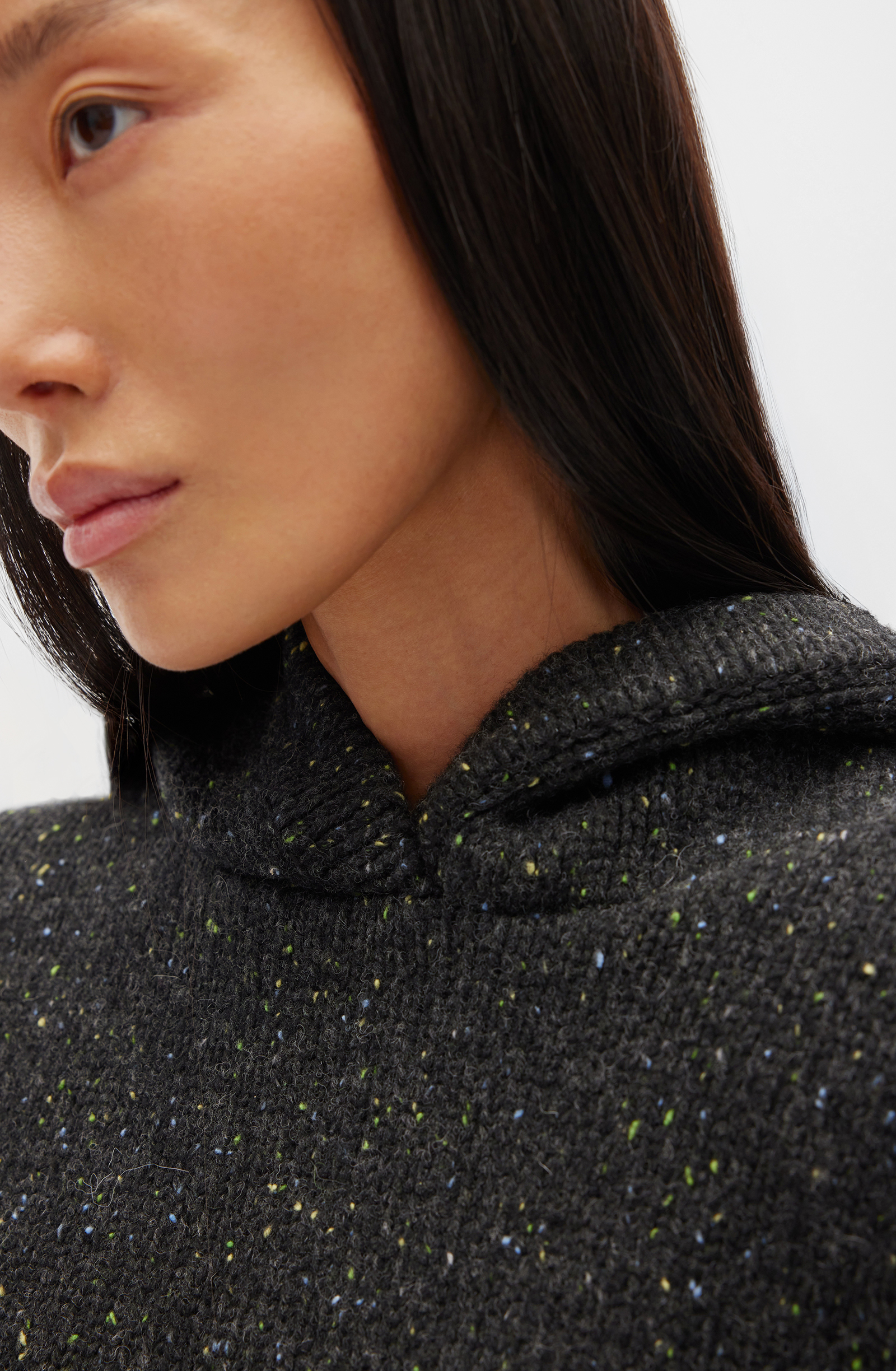 Объемный свитер прямого кроя с приспущенной линией плеч сочетает в себе непринужденность и комфорт. Манжеты длинных рукавов и нижний край оформлены эластичной вязкой в рубчик, улучшающей посадку. Глубокий капюшон служит оригинальным декором, а при необходимости защищает от ветра. Модель выполнена из фактурной меланжевой пряжи, которая создает уникальный рисунок. Мягко прилегая к телу, она поддерживает чувство комфорта и сохраняет тепло в непогожие дни. Лаконичный дизайн делает свитер базовой частью осенне-зимнего гардероба. Его можно комбинировать с повседневными и спортивными брюками, прямыми платьями и юбками миди, а также укороченными куртками, создавая уютные образы для города и активного отдыха.