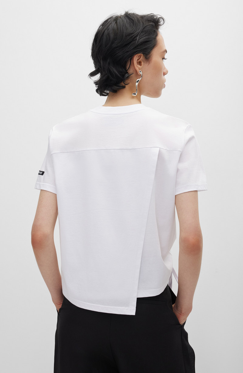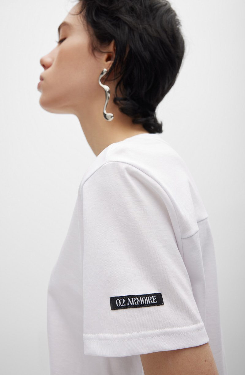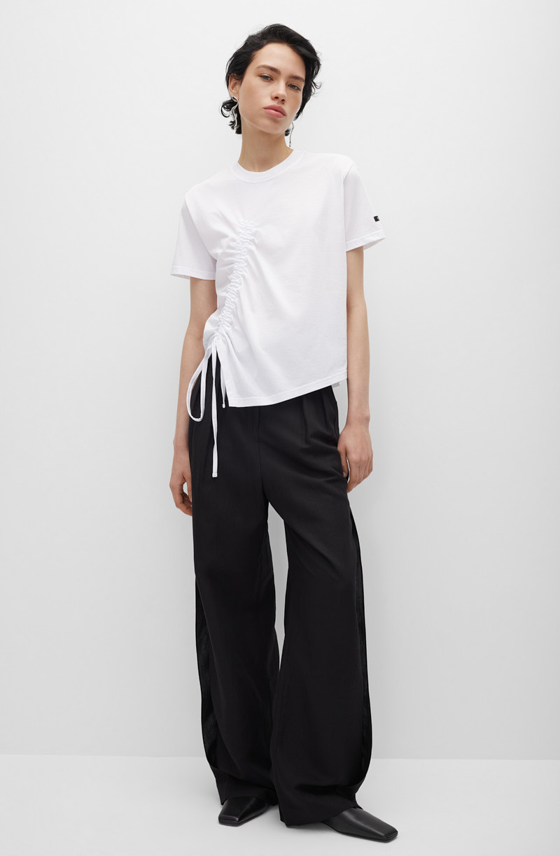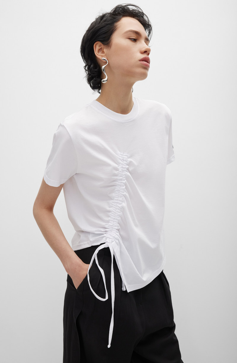 Блуза с короткими рукавами и классическим круглым вырезом прямого кроя обеспечивает комфорт при ежедневном ношении. Базовый предмет гардероба отличается оригинальным декоративным элементом: спереди оформлены сборки, завязывающиеся на шнурок. Модель с вытачкой на спине демонстрирует асимметричный подол, что придает образу современную динамику и индивидуальность. Мягкий хлопок высокого качества обладает хорошей воздухопроницаемостью, приятен на ощупь, хорошо держит форму. Для создания современного образа рекомендуется сочетать с джинсами, легкими или спортивными брюками. Модель вписывается в концепцию уличного стиля или кэжуал, легко дополняется минималистичными аксессуарами.