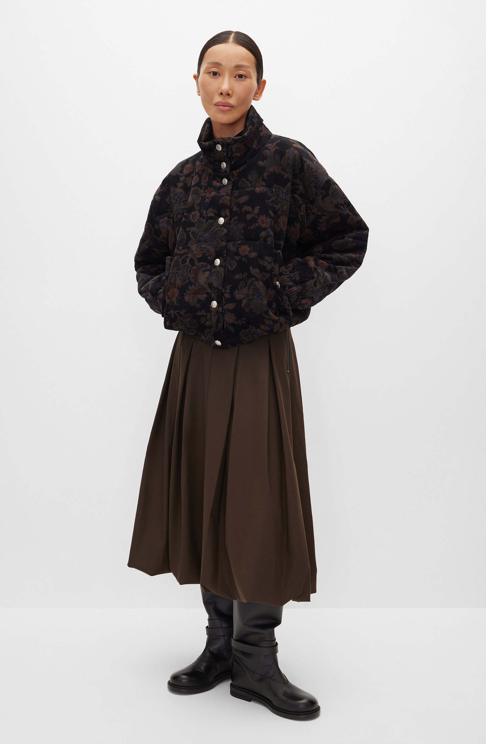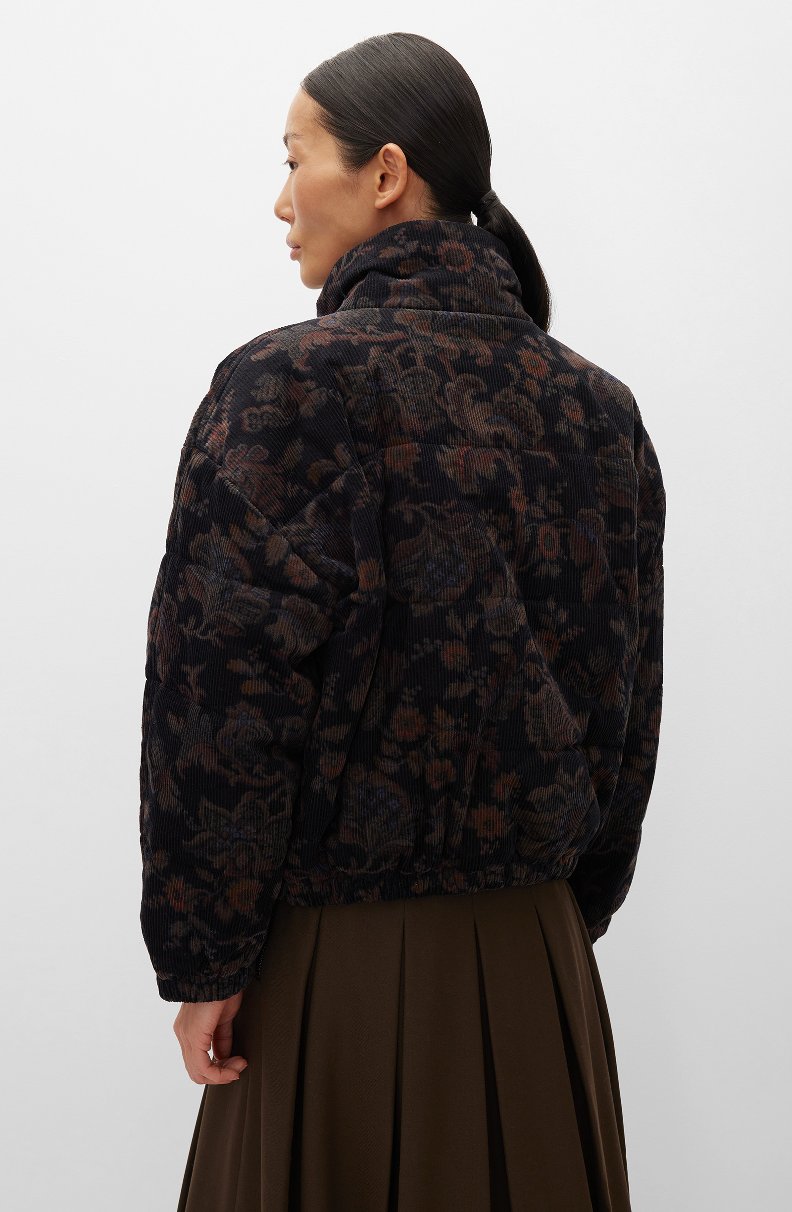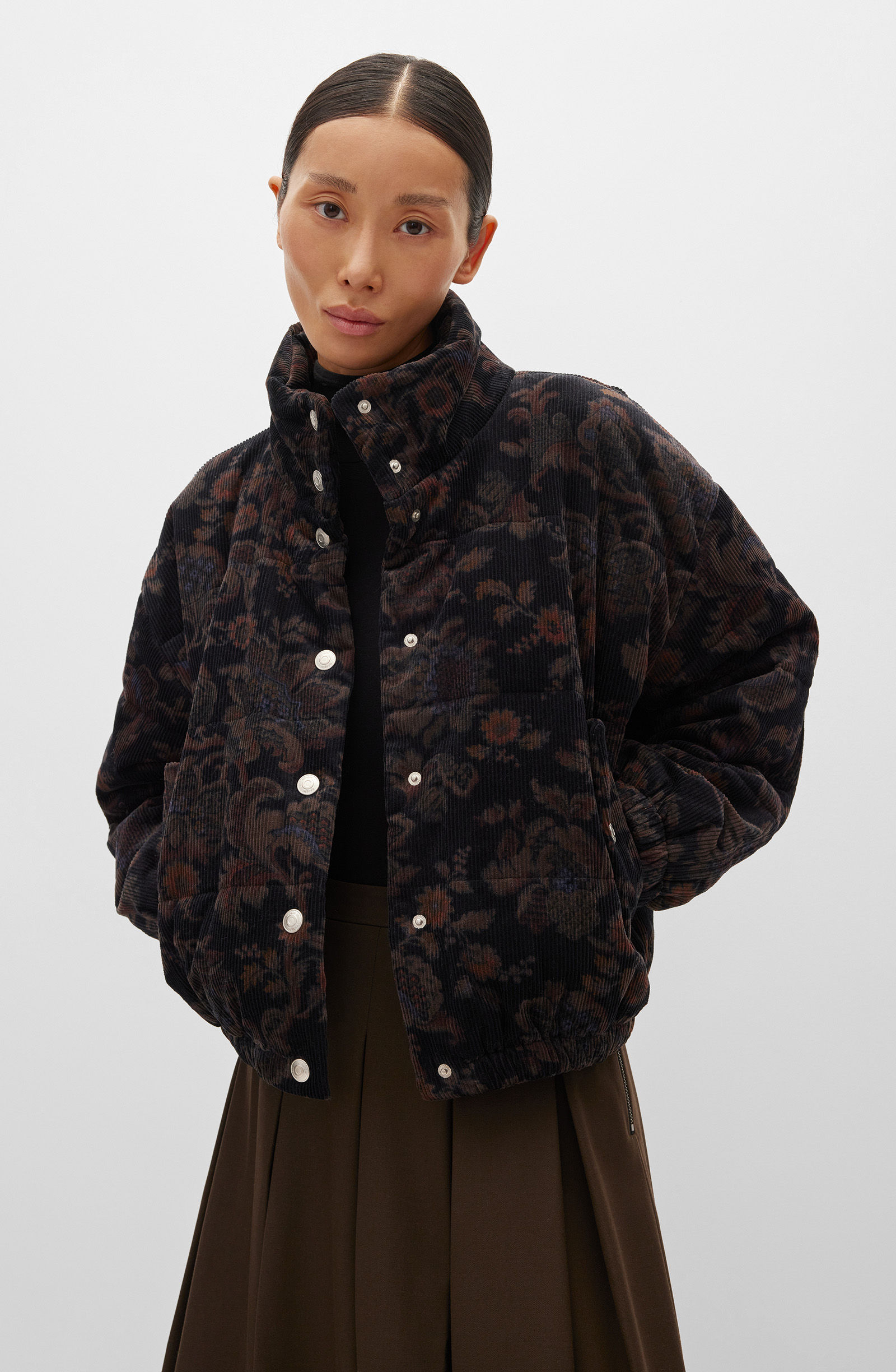 Объемная куртка прямого кроя с высоким воротником-стойкой и застежкой на металлические кнопки. Приспущенная линия плеча создает расслабленный образ. Внутренние боковые карманы на кнопках позволяют греть руки и хранить мелкие вещи. Эластичные манжеты длинных рукавов и резинка по нижнему краю дают возможность регулировать посадку. Модель выполнена из мягкого фактурного вельвета, стеганного с утеплителем. Шелковистая подкладка создает дополнительную защиту от холодного воздуха и обеспечивает комфортное прилегание. Куртка легко комбинируется с юбками, брюками и платьями из аналогичного материала. Составит также органичные комплекты с джинсами, свитерами, пуловерами и леггинсами, согревая и поддерживая уют в холодные дни.