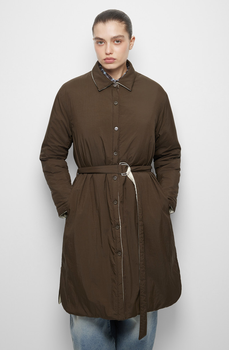 Однобортное пальто прямого силуэта выполнено с отложным воротником и втачными рукавами стандартной длины. Модель застёгивается на пробивные металлические кнопки, которые добавляют лаконичный акцент. В нижних боковых швах предусмотрены округлые разрезы, создающие лёгкость линии. Съёмный пояс фиксируется на шлёвках и при желании акцентирует талию. Длина изделия выше колена делает силуэт универсальным и уравновешенным. Лёгкая, но плотная ткань обладает ветрозащитными и водоотталкивающими свойствами, сохраняя комфорт в переменчивую погоду. Контрастная стёганая подкладка не только поддерживает тепло, но и обеспечивает удобство при движении, оставаясь воздухопроницаемой. Такое пальто органично впишется в осенне-зимний гардероб и станет основой многих повседневных сочетаний. Оно хорошо смотрится с базовыми прямыми брюками, палаццо, джинсами, тёплыми платьями или юбками миди. Для завершения образа подойдут ботинки на плоской подошве или устойчивом невысоком каблуке.