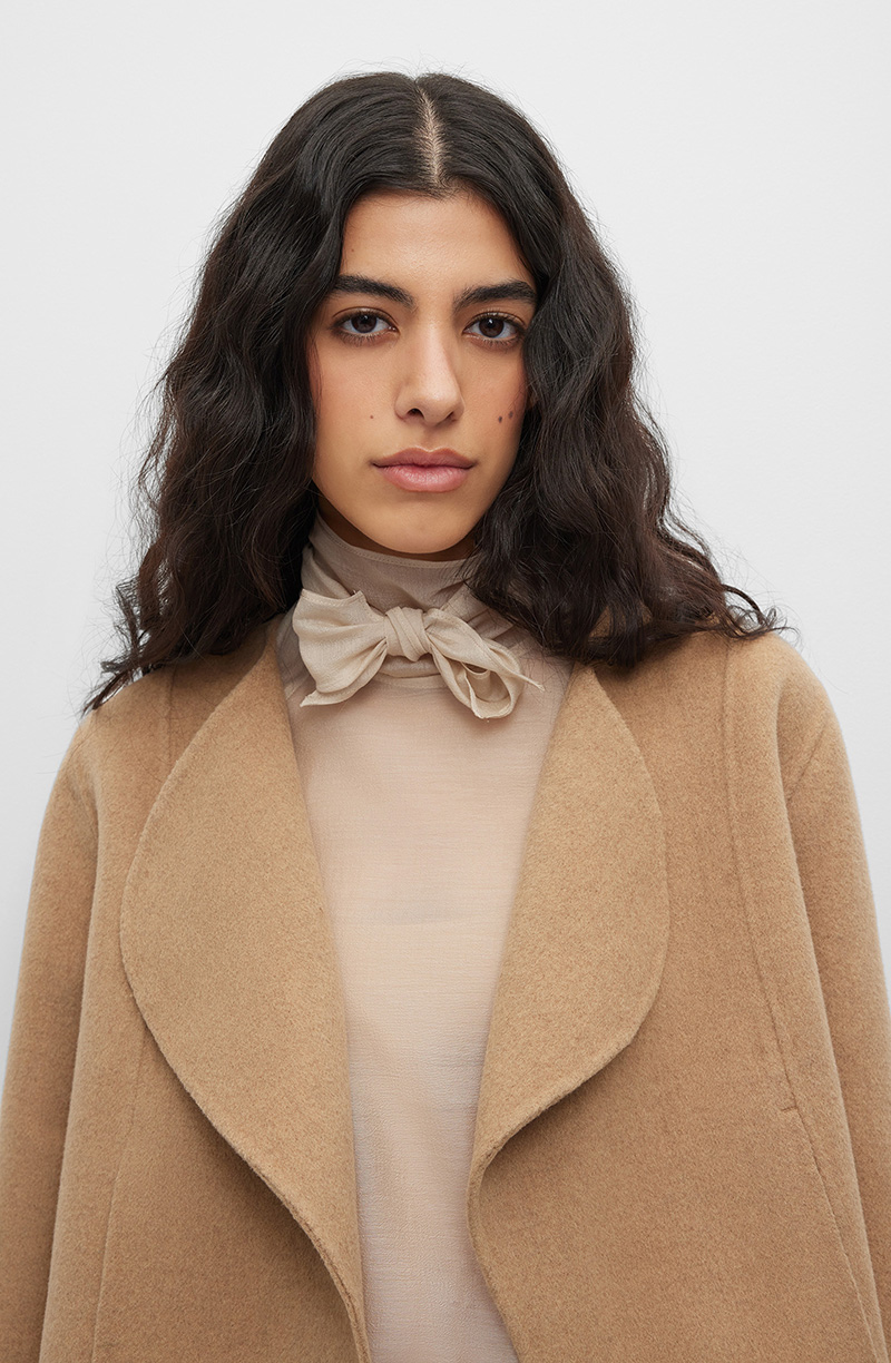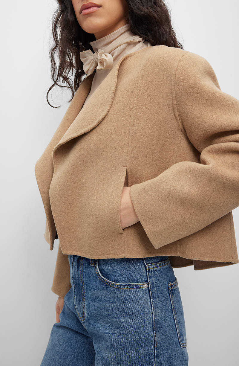 Пальто прямого кроя укороченной длины до линии талии из шерстяной ткани с добавлением кашемира. Модель с воротником с полукруглыми отворотами и двумя прорезными карманами по бокам. Лаконичный дизайн без лишних деталей подчеркивает чистоту линий силуэта. Рукава классической длины завершают сбалансированную пропорцию. Плотная ткань с кашемировой составляющей обладает высокой теплоизоляцией и мягкой драпировкой. Материал сохраняет форму, устойчив к сминанию и обеспечивает комфорт при ношении. Пальто сочетается с платьями-миди и брюками-скинни, водолазками и объемными джемперами. Хорошо комбинируется с обувью на каблуке и кожаными аксессуарами. Подходит для деловой среды, городских прогулок и вечерних выходов.