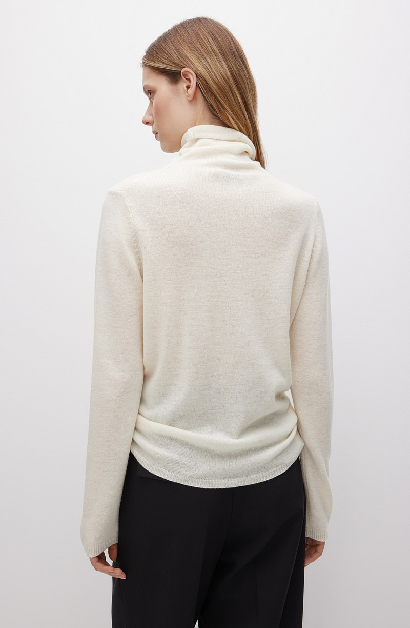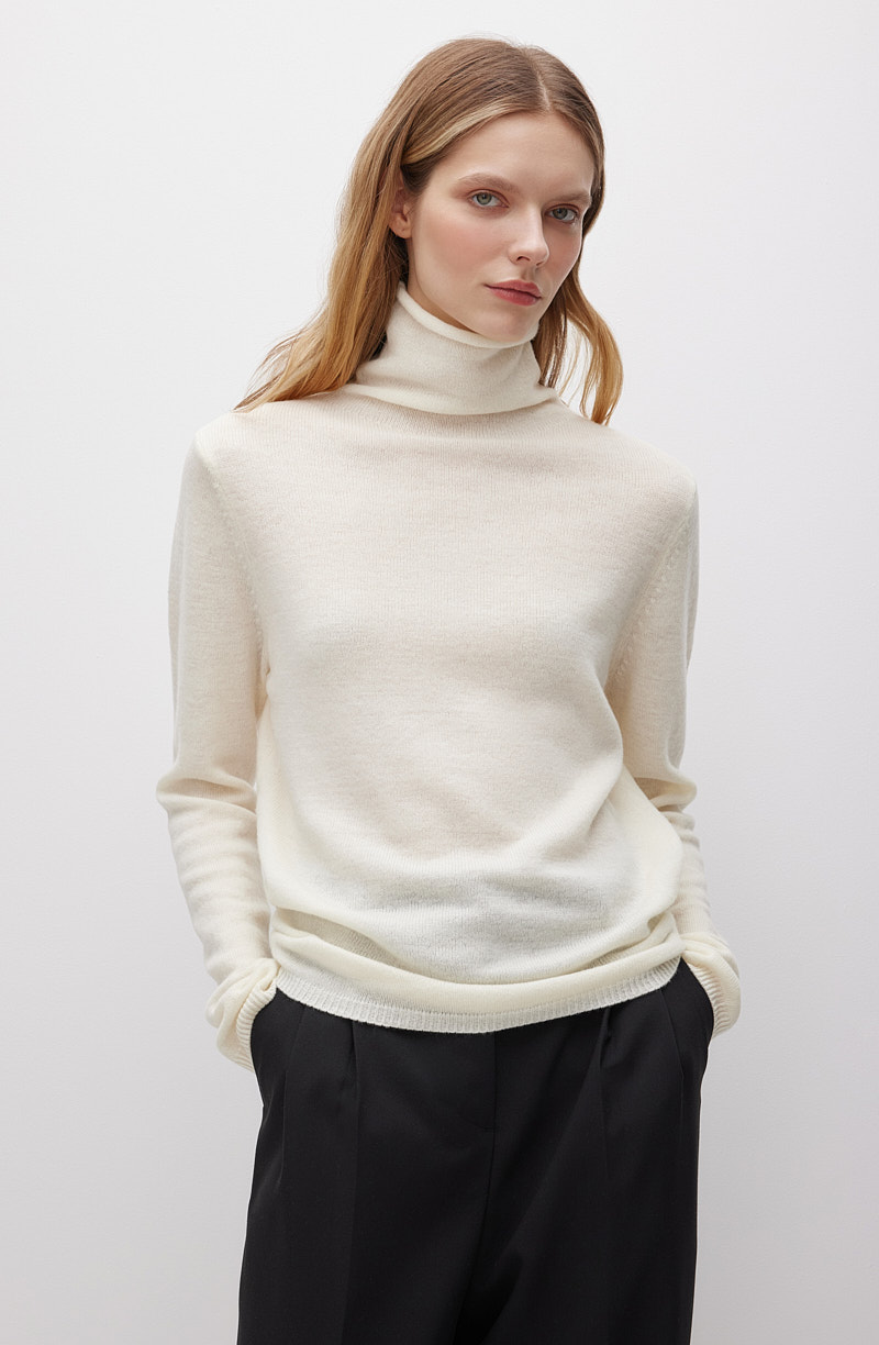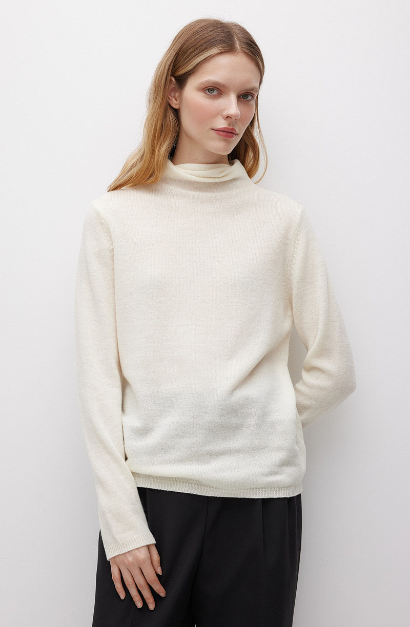 Свитер прямого силуэта с длинными втачными рукавами и воротником-стойкой. Комфортная длина до середины бедра. Низ изделия и рукавов обработан вязаной резинкой 1х1. Модель выполнена из мягкой и эластичной шерстяной пряжи сочного зеленого цвета. Равномерное гладкое полотно бережно согревает в холодную погоду и годами сохраняет свой привлекательный вид. Свитер сочетается с прямыми джинсами, базовыми брюками, шортами или плотными колготками и мини-юбками. В комбинации с теплыми жилетами, куртками и пальто он станет ключевым элементом уютных осенне-зимних комплектов.