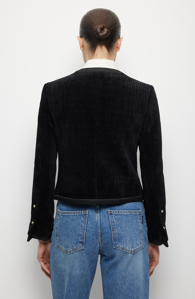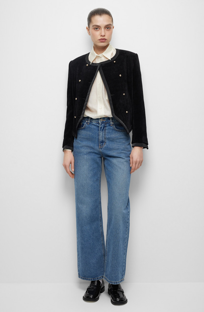 Двубортный жакет слегка приталенного силуэта подчёркивает линию плеч и выполнен с округлым вырезом горловины. Втачные рукава стандартной длины дополнены расклёшенными у запястья манжетами, что придаёт образу утончённость. Края, борта и вырез оформлены тесьмой, а контрастные пуговицы в два ряда создают выразительный акцент. Длина изделия чуть выше линии бедра делает силуэт лёгким и пропорциональным. Материал средней плотности с мягкой бархатистой фактурой приятен на ощупь, хорошо держит форму и согревает в прохладные дни. Шелковистая подкладка поддерживает аккуратную посадку и ощущение комфорта на протяжении всего дня. Такой жакет станет неотъемлемой частью демисезонного гардероба и при необходимости заменит лёгкую куртку или ветровку. Он гармонично сочетается с джинсами, классическими платьями, прямыми юбками и брюками, позволяя создавать разные варианты повседневных и более собранных образов.